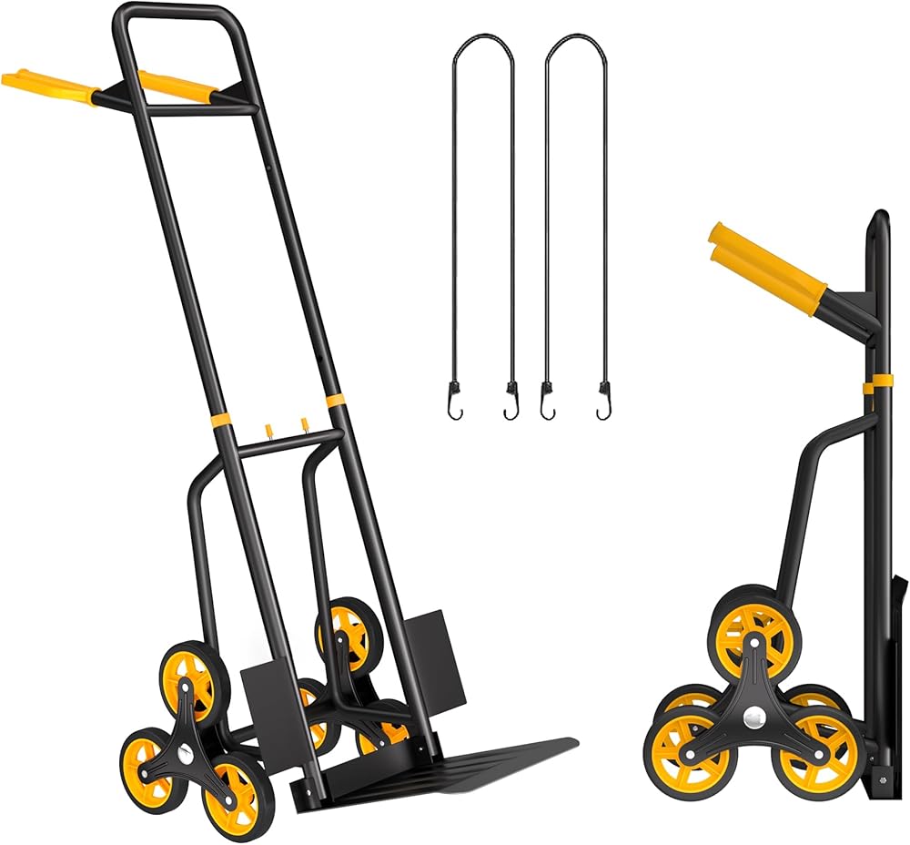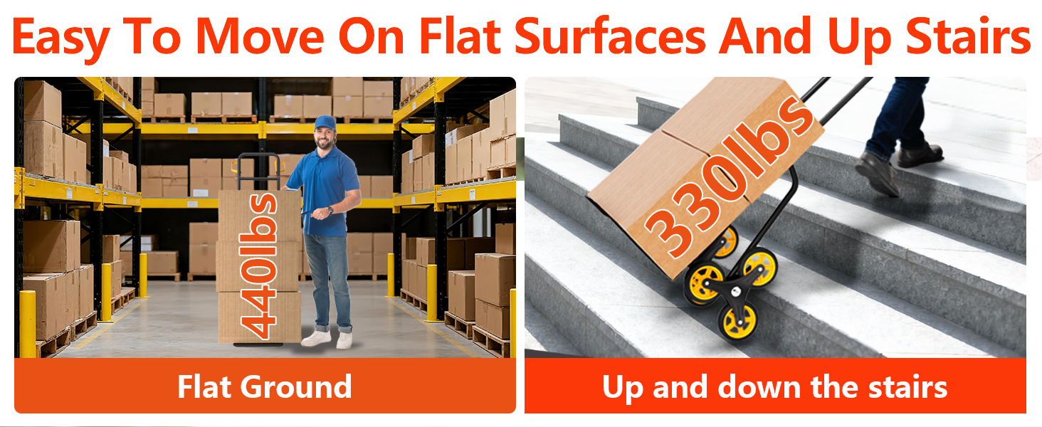 شاحنة يدوية شديدة التحمل للسلالم: يمكن لشاحنتنا اليدوية لتسلق السلالم أن تتحمل حمولة تصل إلى 440 رطلاً على أرض مسطحة وتتمتع بقدرة تسلق تصل إلى 300 رطل. وهذا يجعله خيارًا مثاليًا لنقل الأشياء الثقيلة لأعلى ولأسفل السلالم.