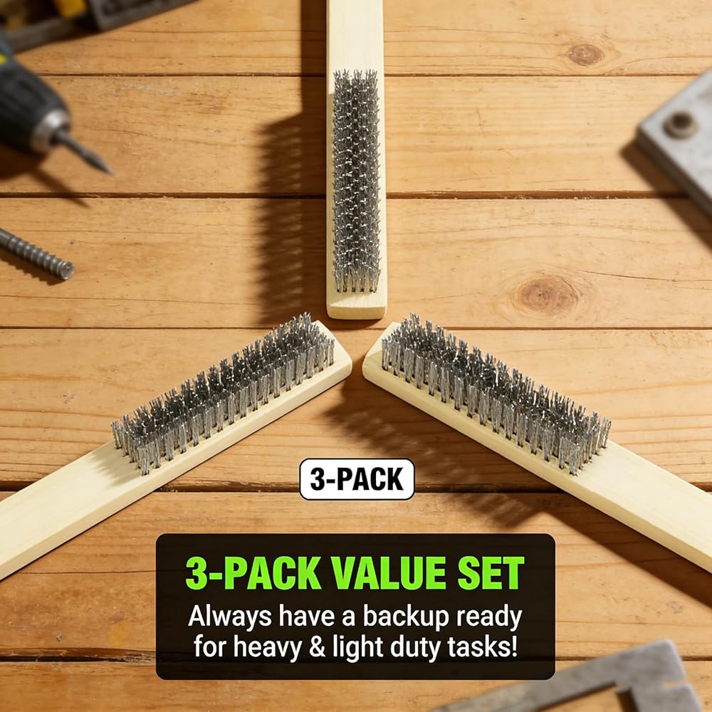 • 【Reliable Three-Pack Value】: Get a complete set ready for action. This package includes three identical stainless steel scratch brushes with wood handles, ensuring you always have a backup on hand for tackling heavy and light duty cleaning needs.