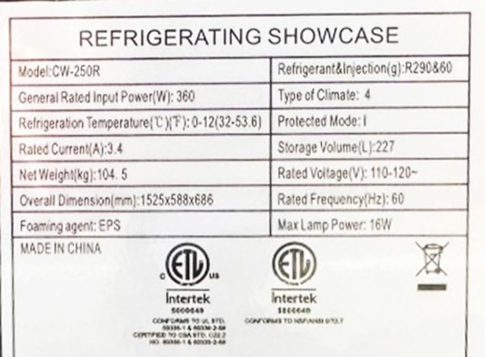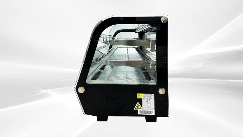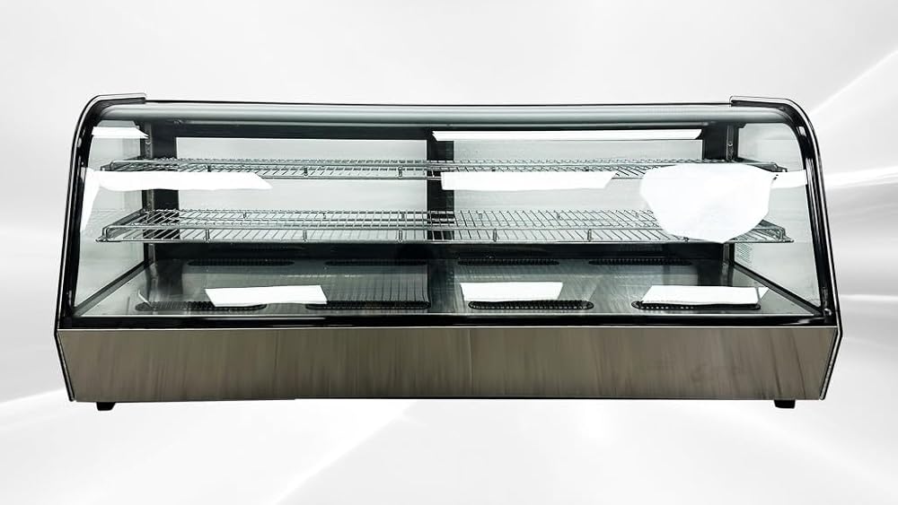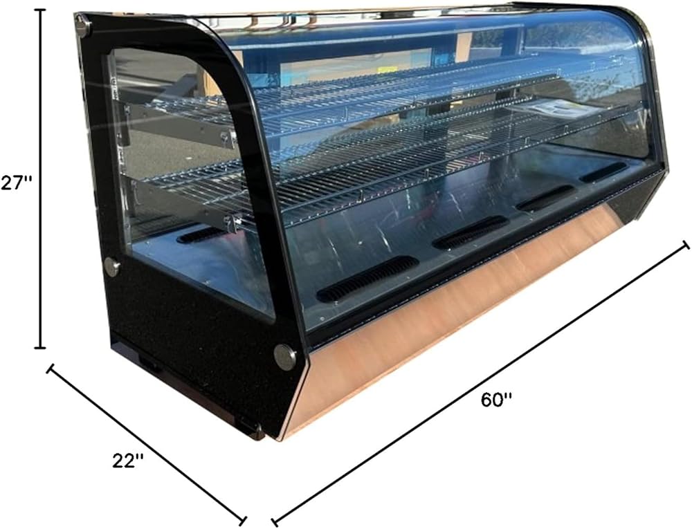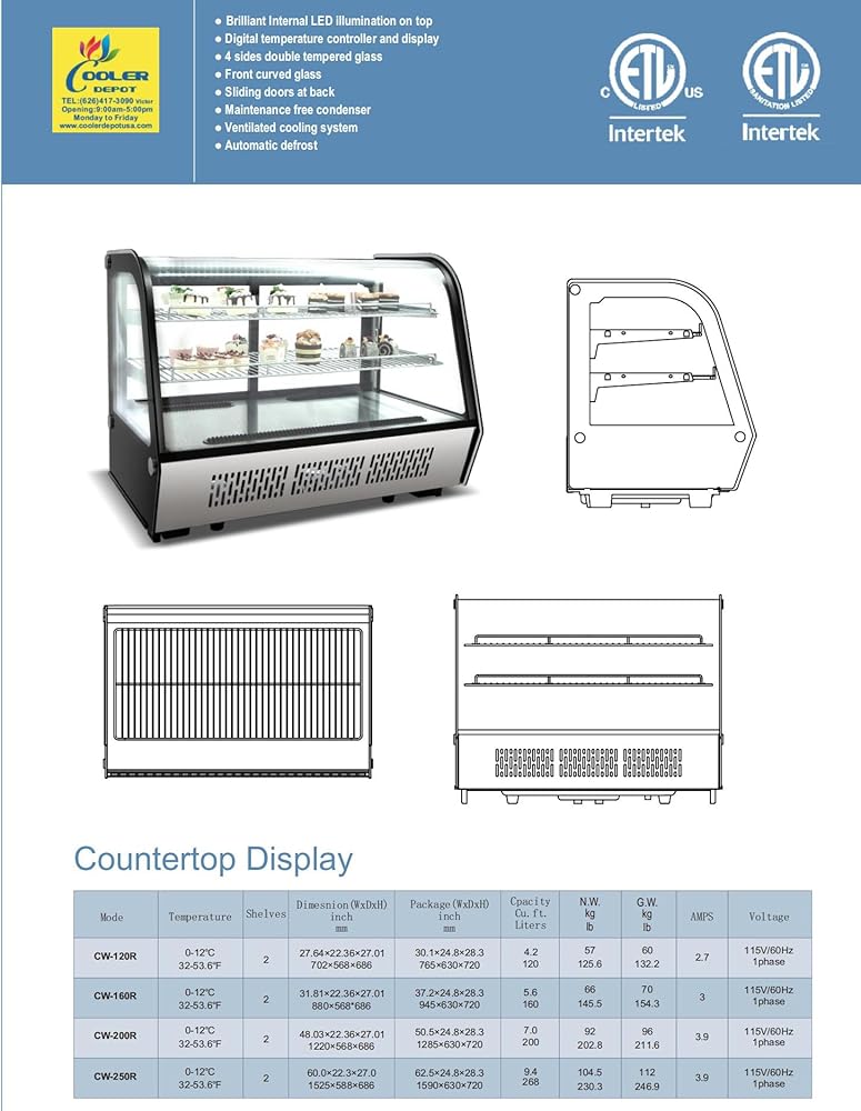 Bakery Display Cooler Refrigerated Case Countertop Desktop Slope Round-Corner 60 ins Commercial Restaurant Pastry Deli Stainless Steel Base Curved Glass NSF Food Cooler CW-250R Overall Dimensions: Dimensions L60" x D22.5" x H27" Voltage: 110V~120V 32°F~53.6°F. Includes 2 Shelves The case also has two chrome-plated wire interior shelves that you can adjust depending on the items you want to display. The Storage Capacity is 268 Liters. Bright LED Lighting This bakery display case features bright, cool LED lighting that is designed to show off your chilled baked goods! With a proper display, your bakery items can merchandise themselves and increase impulse sales. Reduced Condensation A specialized air outlet design circulates air against the curved glass front to reduce the build-up of condensation. Without condensation to get in the way, your customers will always have clear visibility to your tempting desserts! Unobstructed View The curved front glass provides an unobstructed view of your food while the side glass panels and the rear glass access doors ensure that customers can see the case's contents from any angle.