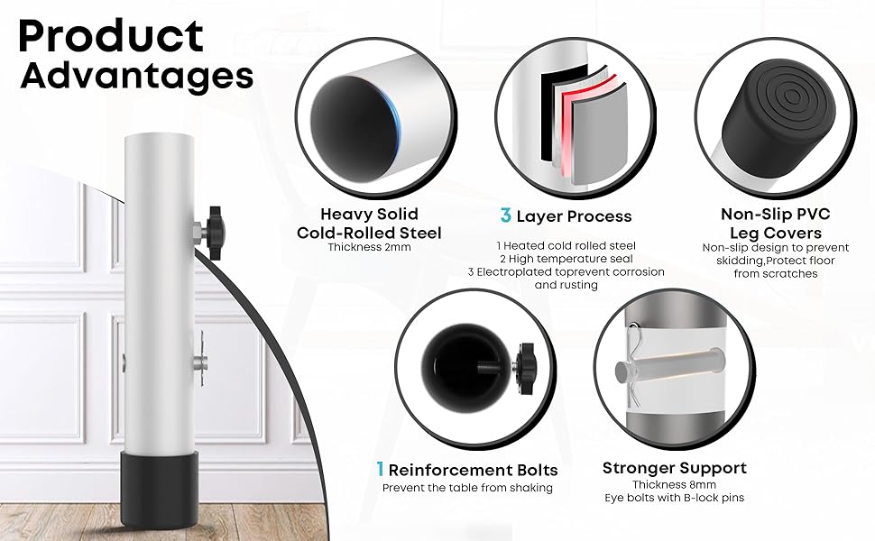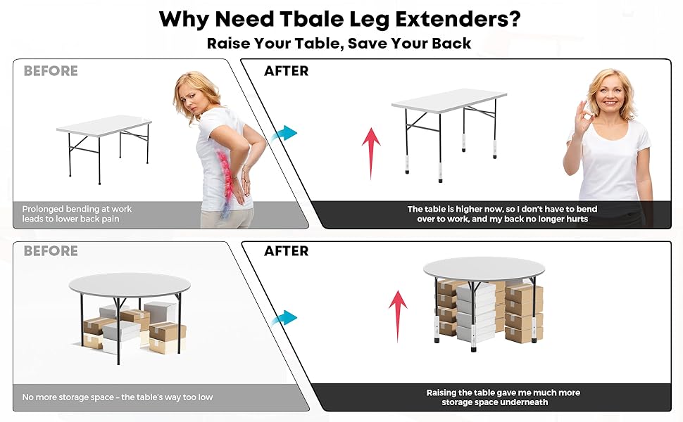 [تخزين إضافي تحت الطاولة] واحدة من أكثر الفوائد المحبوبة لرافعات رفع الطاولة المكونة من 4 قطع - أضف مساحة تخزين رأسية قيمة أسفل طاولتك! قم بتحرير المساحة الأرضية عن طريق تخزين الكراسي القابلة للطي أو صناديق التخزين أو المبردات أو مستلزمات الحيوانات الأليفة أو معدات التخييم. بالنسبة للمكاتب المنزلية، يمكن رفع الطاولات عن أكياس الكمبيوتر المحمول أو صناديق الملفات؛ بالنسبة لأكشاك سوق السلع المستعملة، فإنها تحافظ على إمكانية الوصول إلى المخزون الإضافي — كل ذلك باستخدام رافعات ارتفاع الطاولة.