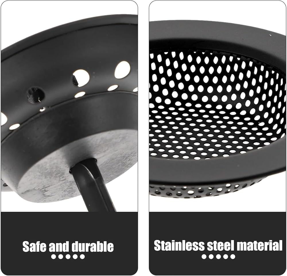 This 3-piece black stainless steel sink strainer set includes a 4.3in (11cm) strainer basket, 3.3in (8.5cm) sealed stopper, and a 3.1in (8cm) waste disposal plug. Made from food-grade stainless steel with a matte black finish, this set brings a modern touch to your kitchen. The mesh filter effectively traps food particles while allowing water to flow freely, preventing clogs. The tight-seal stopper helps retain water or block odors, making it perfect for soaking dishes or cleaning. Easy to clean and install, this set is compatible with standard kitchen sinks and garbage disposals.