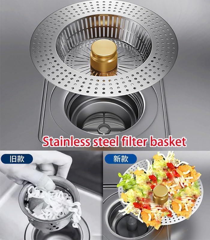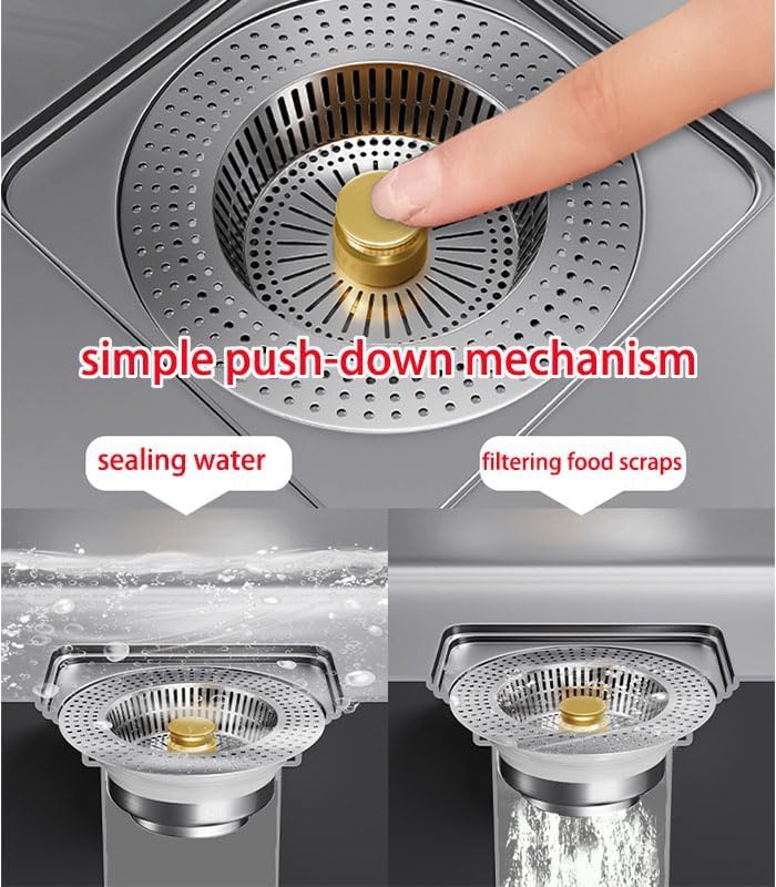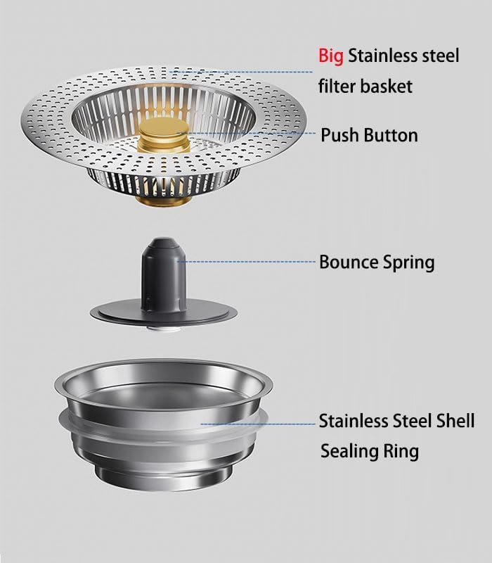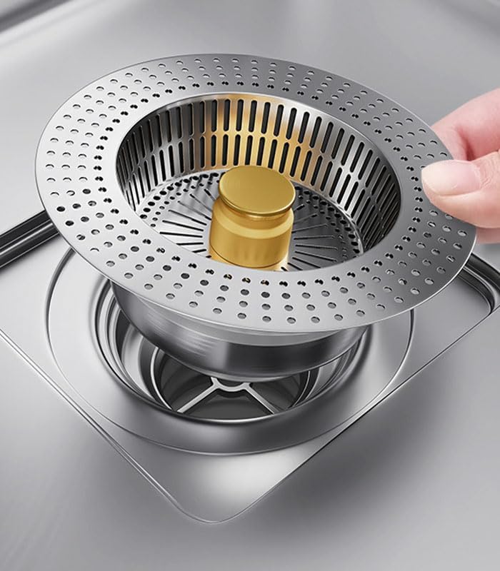 - تصميم مزدوج الوظيفة: يعمل كمصفاة تصريف لالتقاط بقايا الطعام وسدادة حوض لحمل الماء عند الحاجة لغسل الأطباق أو نقع الأشياء.