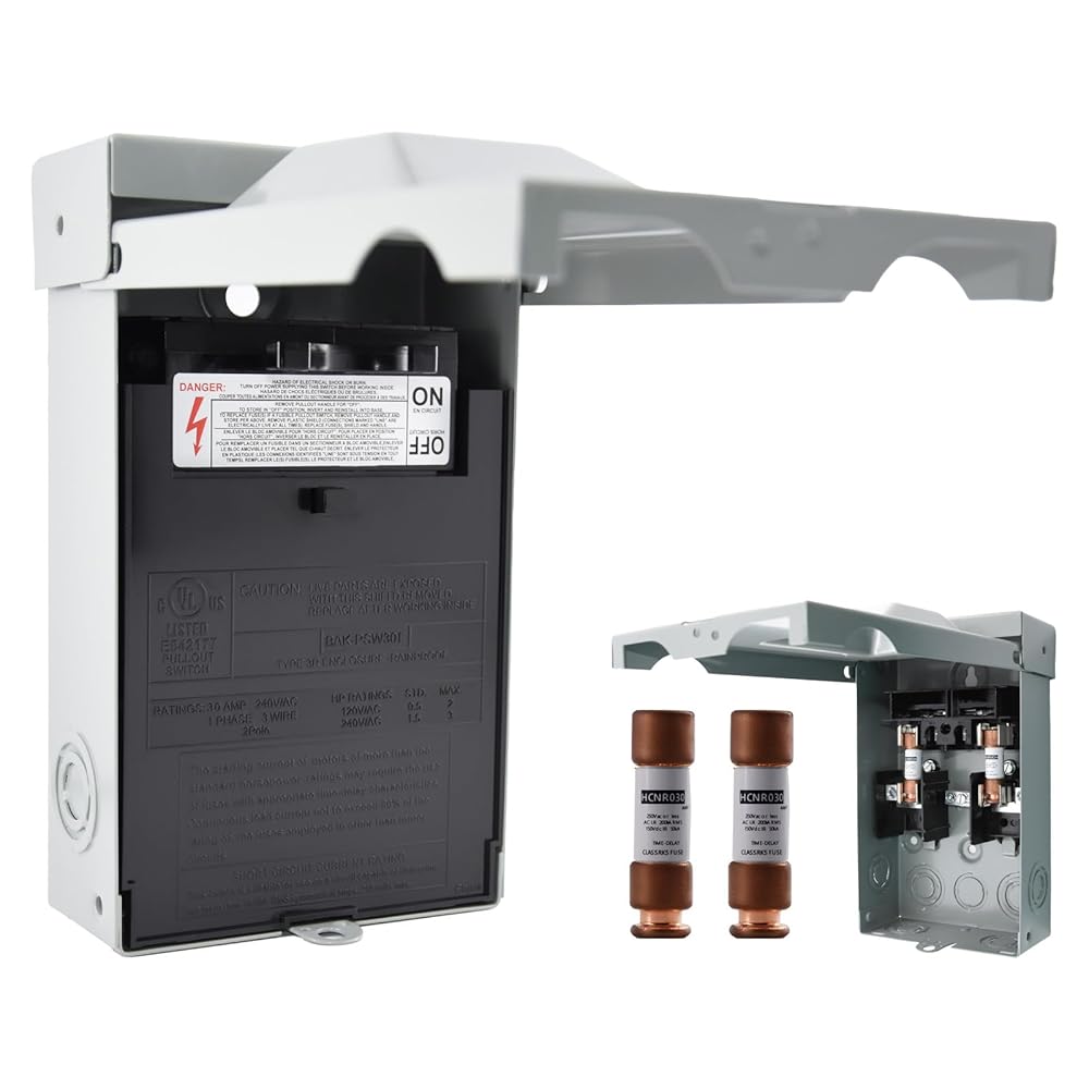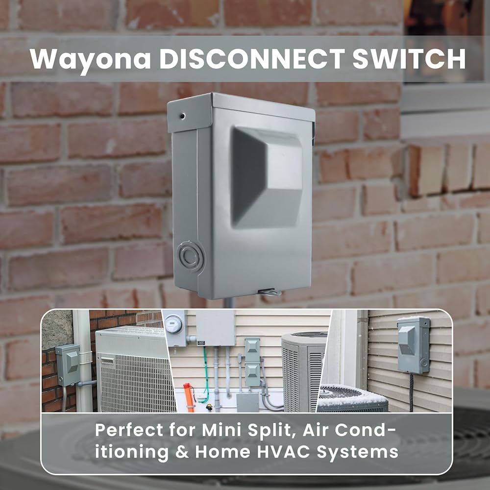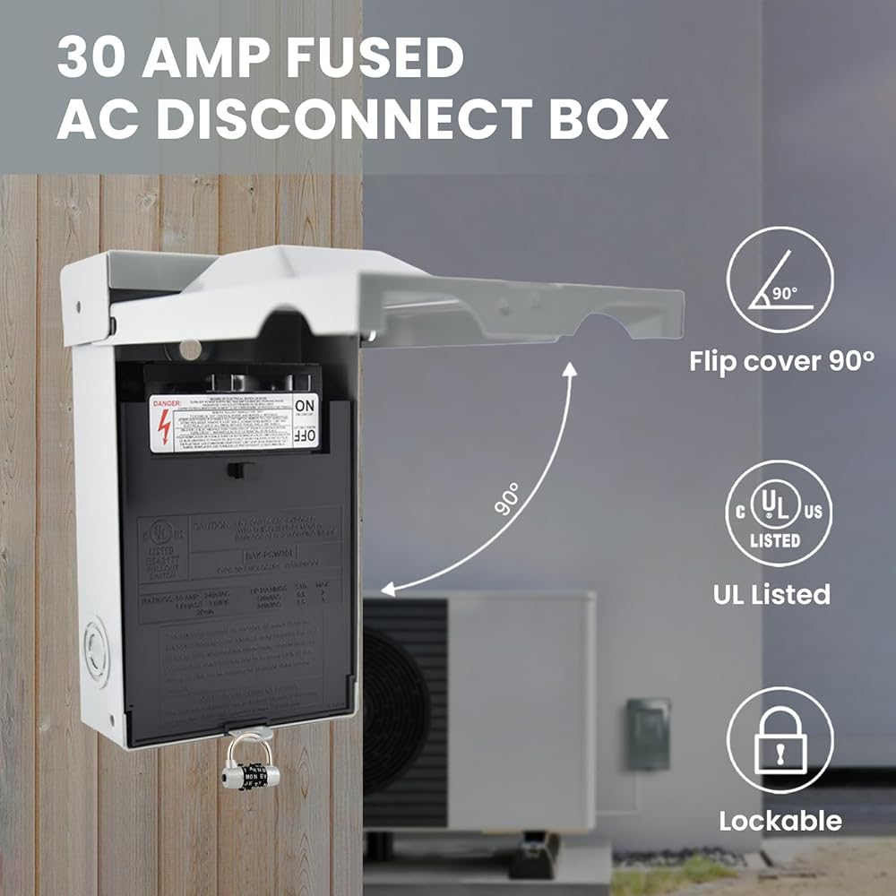 Wayona 30 Amp Fused AC Disconnect Box UL Listed Quick Disconnect Electrical Box Pull-Out Switch NEMA 3R 30 Amp Fused Disconnect Outdoor, 120/240V Single Phase 3-Wire 2-Pole, Weatherproof Disconnect Box for Mini Split, Central Air Conditioner, Heat Pump and HVAC Systems Specifications: ● Type: 30 Amps Fused Disconnect (Fused Included) ● Voltage: 240V AC ● Enclosure Rating: NEMA 3R (Indoor/Outdoor)