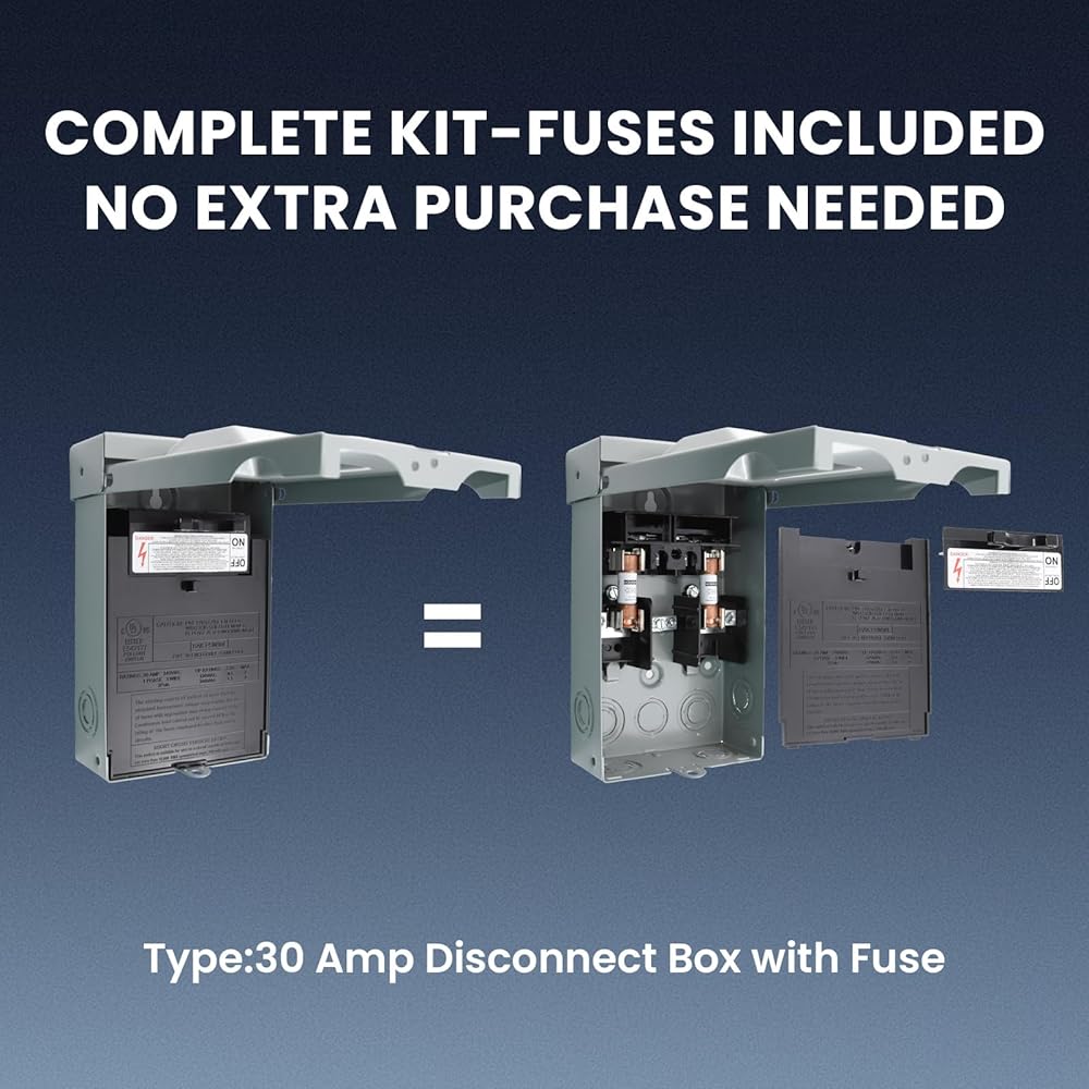 🔌 UL Listed Ac Disconnect Box Outdoor with Fuse: Complete Kit, Ready to Install.This 30 amp disconnect box comes with fuses pre-installed, no extra purchase needed. 120/240V AC, 30A, Single Phase, 3-Wire, 2-Pole, ideal for new installations or replacements, ensuring safe and code-compliant electrical connections.