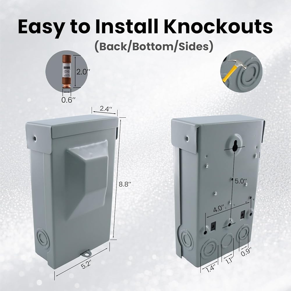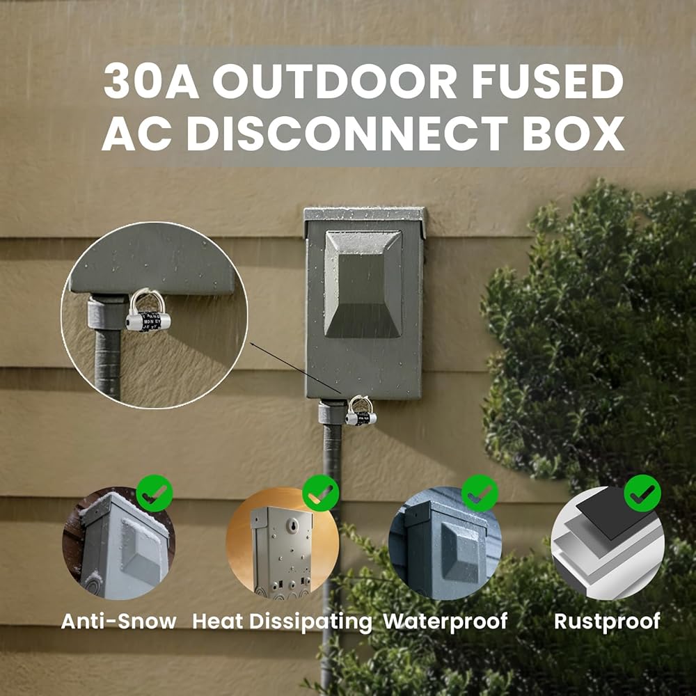 🛡️ Weatherproof Ac Disconnect Box Outdoor 30 Amp: NEMA 3R Rated for Outdoor Use.Built with heavy-duty galvanized steel and powder-coated finish, this 30 amp fused disconnect is designed to withstand harsh weather conditions. Resists rain, freezing, dust, and rust – providing reliable protection for wall-mounted outdoor installations.