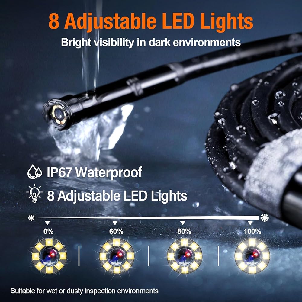 8 مصابيح LED قابلة للتعديل وIP67 مقاومة للماء: 8 مصابيح LED قابلة لضبط السطوع توفر رؤية واضحة في البيئات المظلمة؛ يتيح المسبار المقاوم للماء IP67 الاستخدام الآمن ككاميرا صرف أو كاميرا سباكة مع ضوء في الظروف الرطبة أو الزيتية أو المتربة.