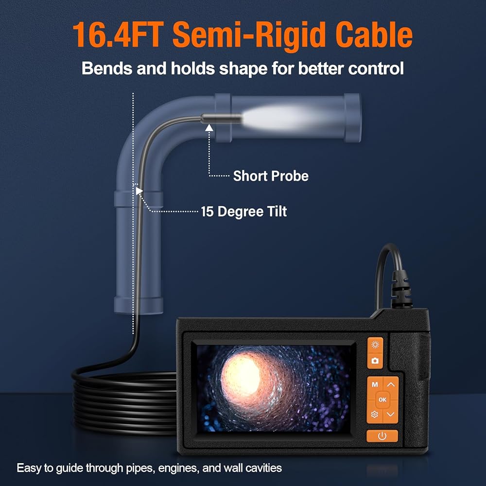 كابل ثعبان شبه صلب بطول 16.4 قدم - سهل التحكم: ينحني الكابل شبه الصلب ويحافظ على شكله، مما يجعل كاميرا الثعبان هذه ذات الضوء سهلة الدفع والتوجيه؛ تعمل بشكل جيد ككاميرا سباكة، أو كاميرا أنابيب، أو كاميرا فحص لمهام إصلاح السيارات والتدفئة والتهوية وتكييف الهواء والمنزل