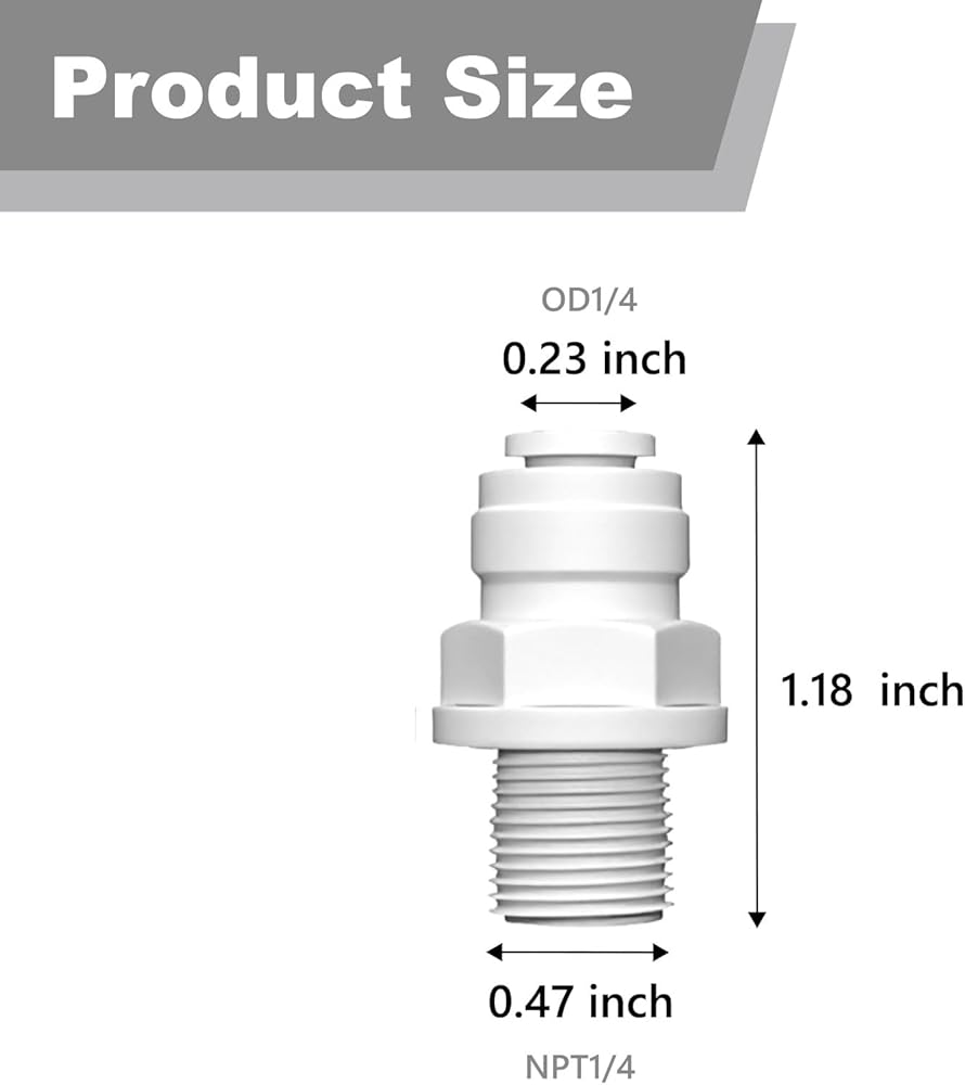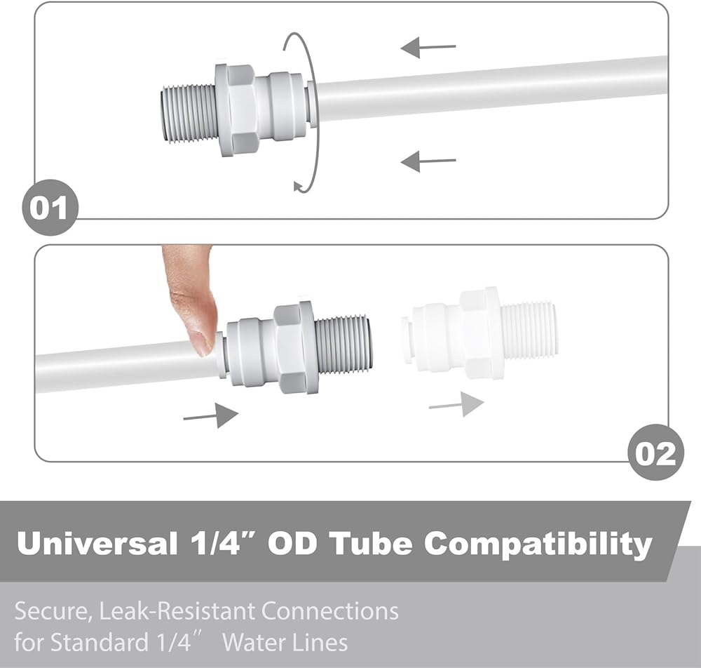 Universal 1/4″ OD Push-To-Connect Fittings: Engineered to accept standard 1/4″ tubing, these 1/4 OD push to connect fittings provide fast, tool-free connections. Simply insert the tube until it seats firmly for a leak-resistant seal.