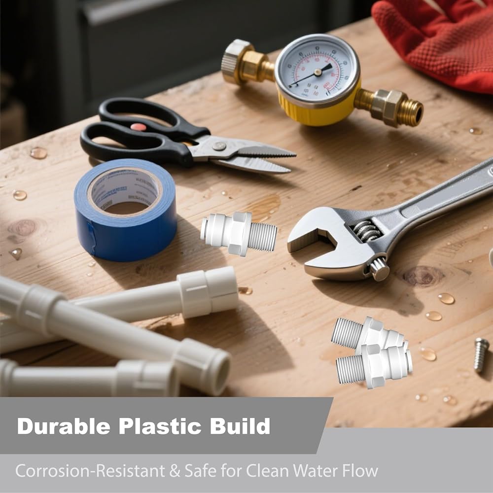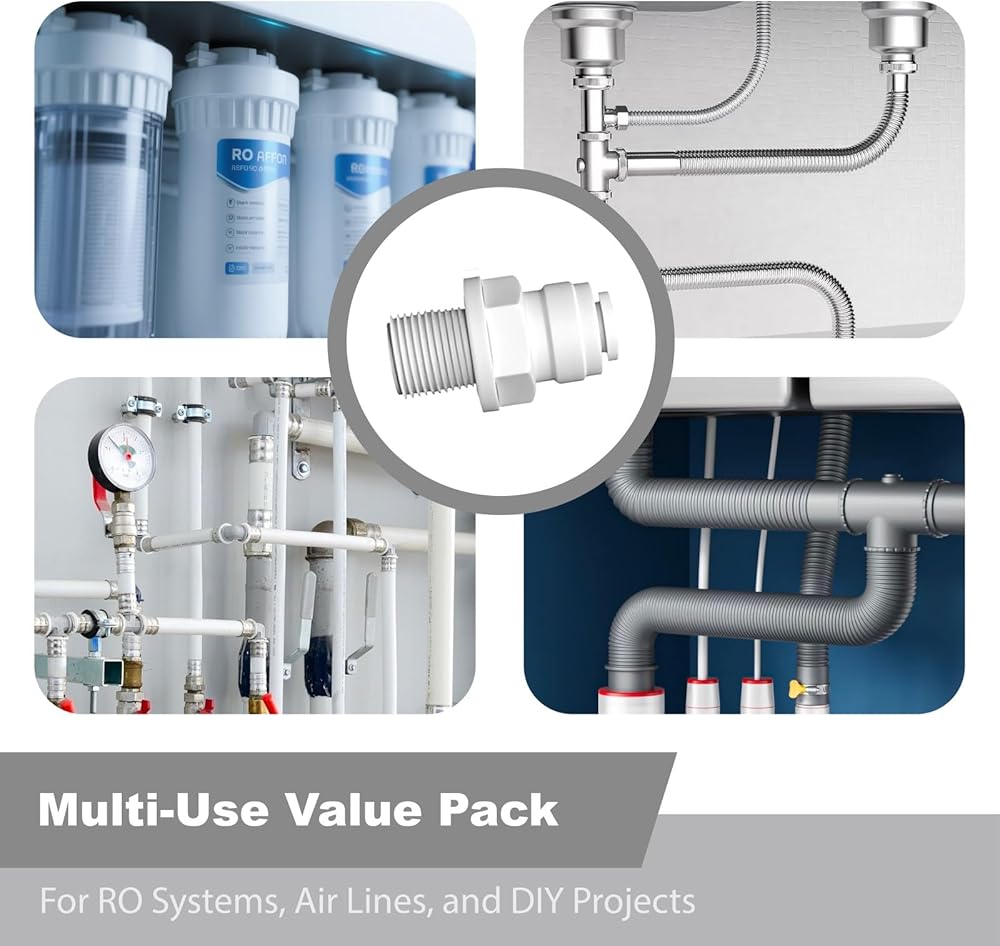 RO/DI Quick Connectors: Includes 10 male push-to-connect tube fittings designed for reverse osmosis and water purifier systems, offering ample supply for new installations or maintenance of your 1/4″ water lines.
