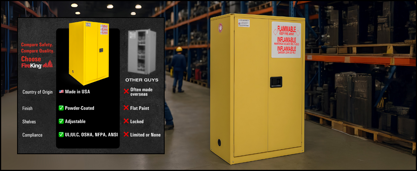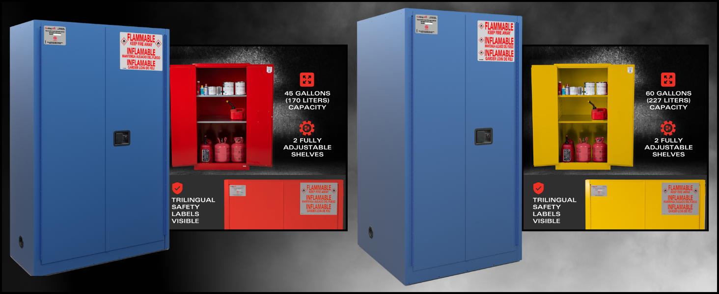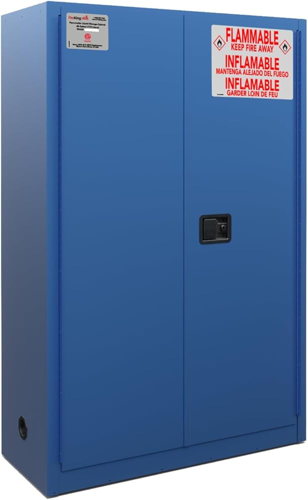 خزانة التخزين القابلة للاشتعال متوافقة مع UL/ULC 1275 وOSHA وNFPA وANSI. يوفر الحماية لتخزين السوائل القابلة للاحتراق بأمان وبما يتوافق مع معايير السلامة الأساسية في البيئات الصناعية أو المختبرية أو ورشة العمل.