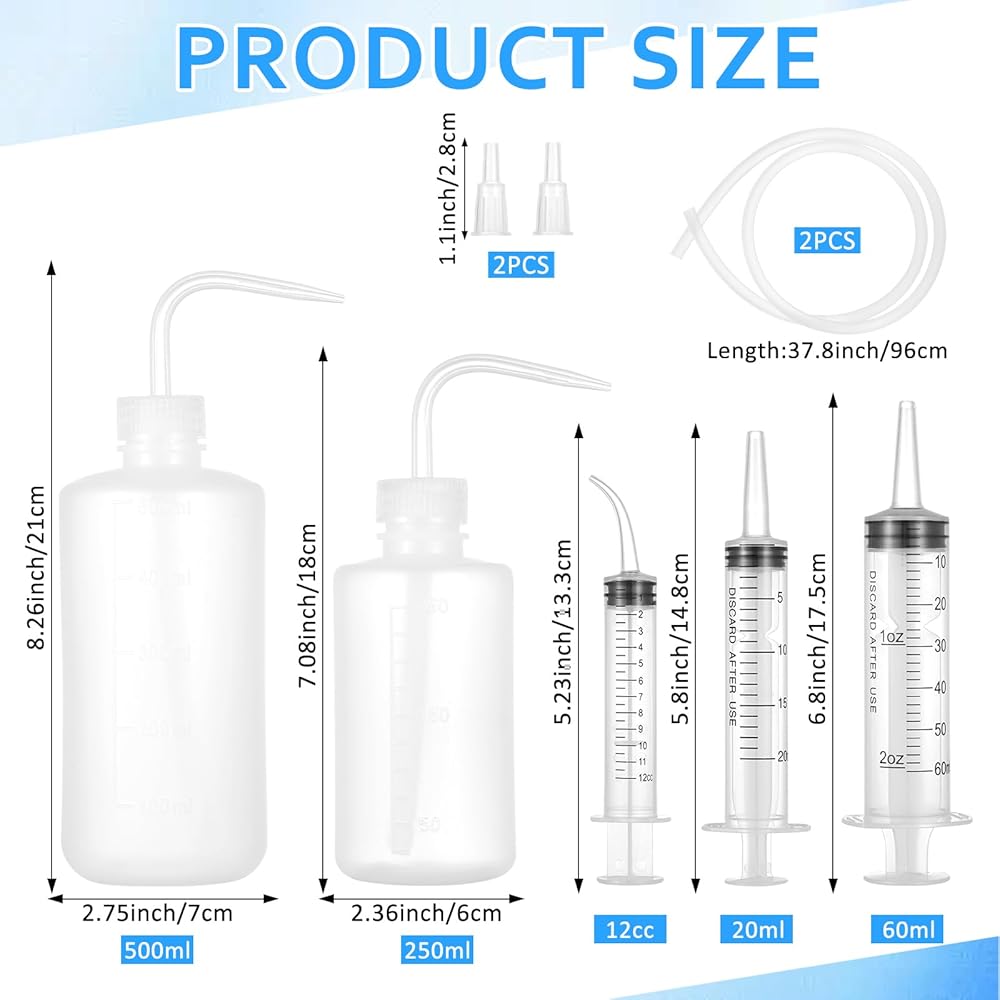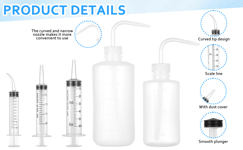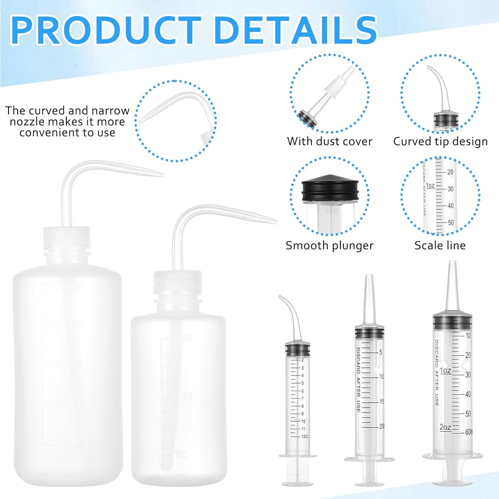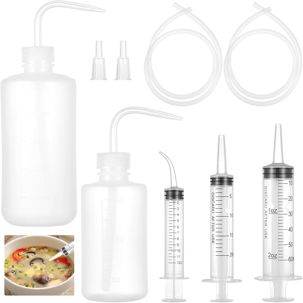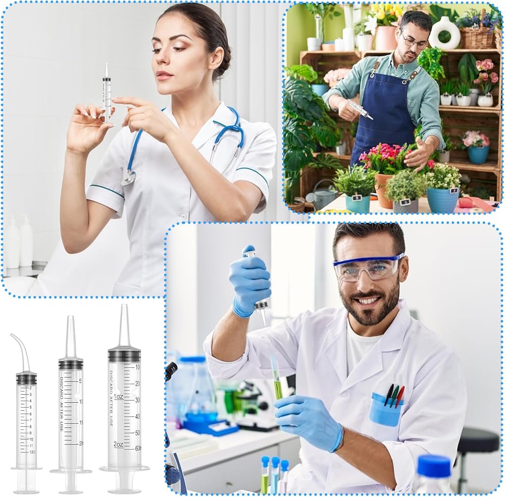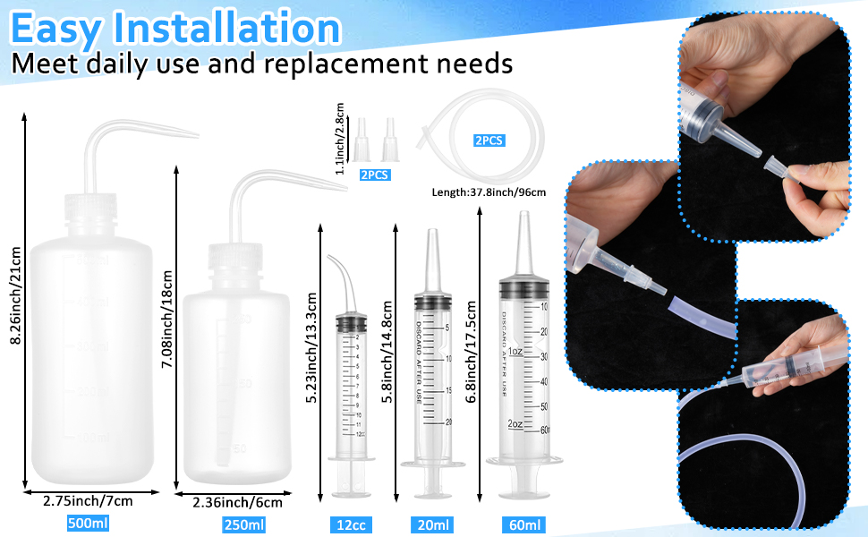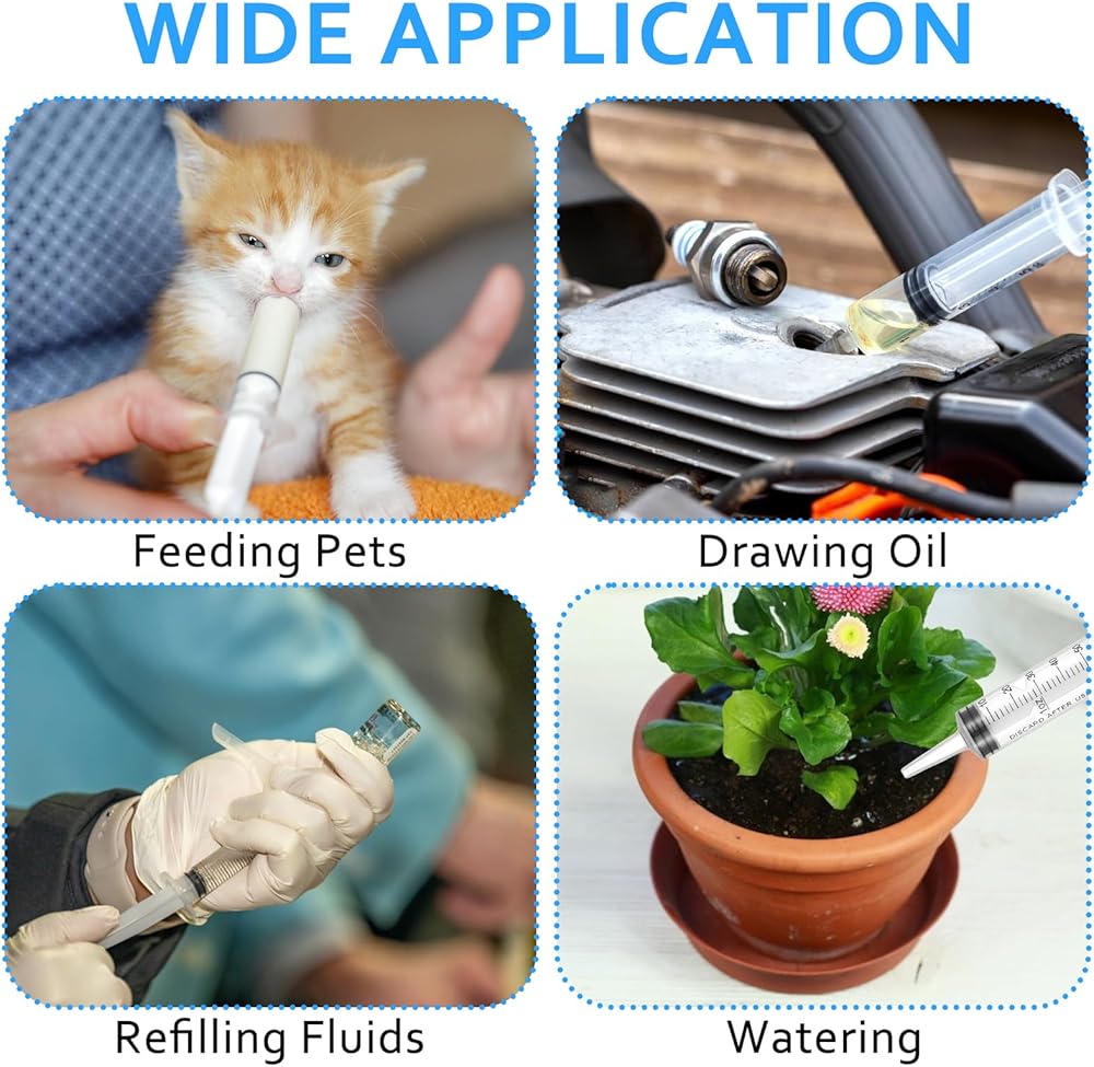 محتويات العبوة: تشتمل هذه المجموعة على حقنتين مستقيمتين (60 مل و20 مل)، وموصلين، وحقنتين مقوستين (12 مل)، وزجاجتين للضغط (250 مل و500 مل)، وخرطومين بطول 1 متر. ويمكن استخدامها في مجموعة متنوعة من التطبيقات، بما في ذلك تغذية الحيوانات الأليفة، وتوزيع السوائل والزيوت، وتطبيق المواد اللاصقة، وري النباتات، والعمليات الصناعية.