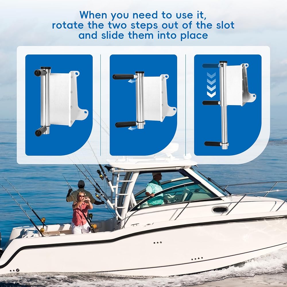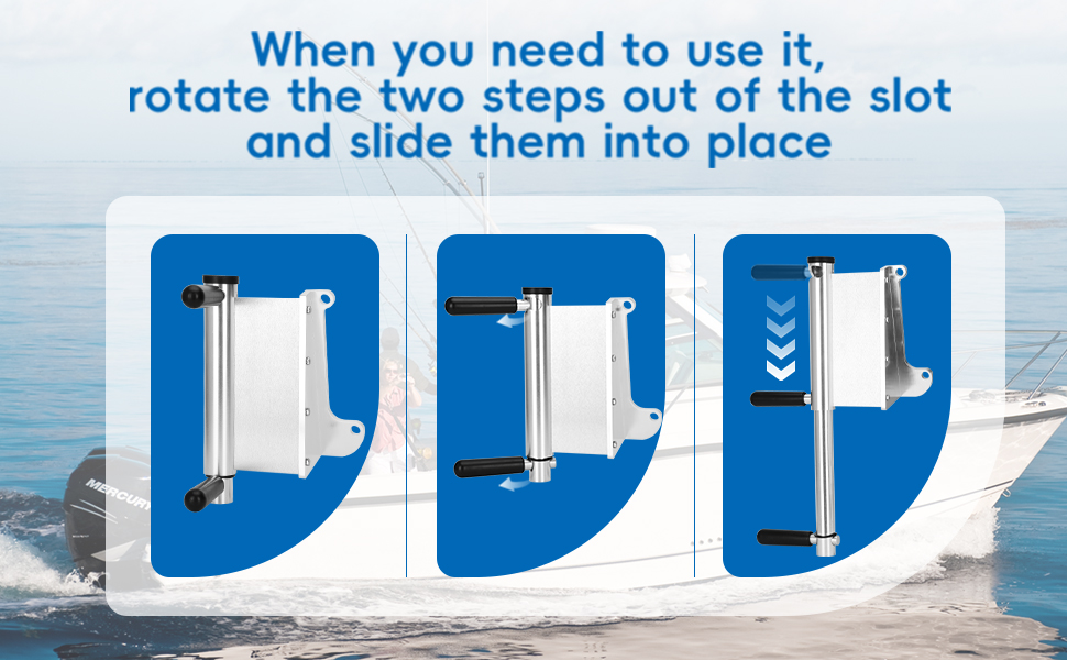 - عند عدم الاستخدام، يمكن تثبيت درجتي سلم القارب بشكل آمن في الفتحة دون شغل مساحة.