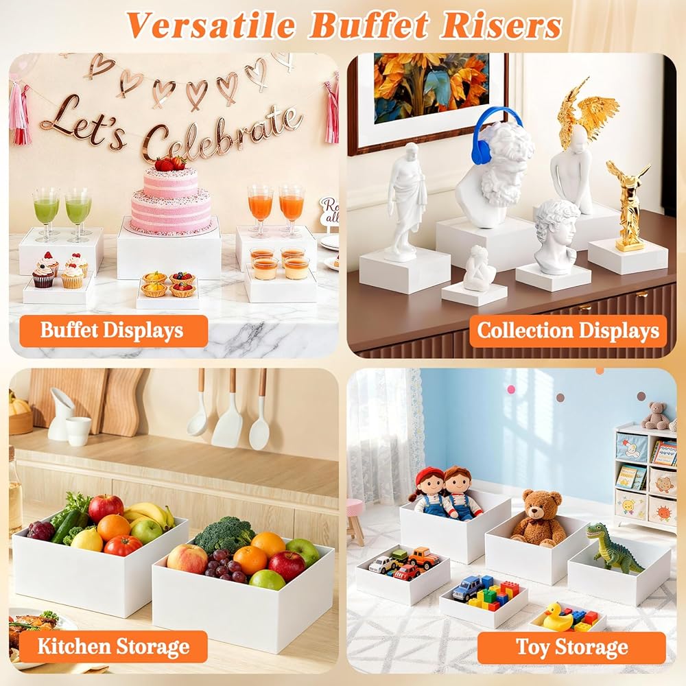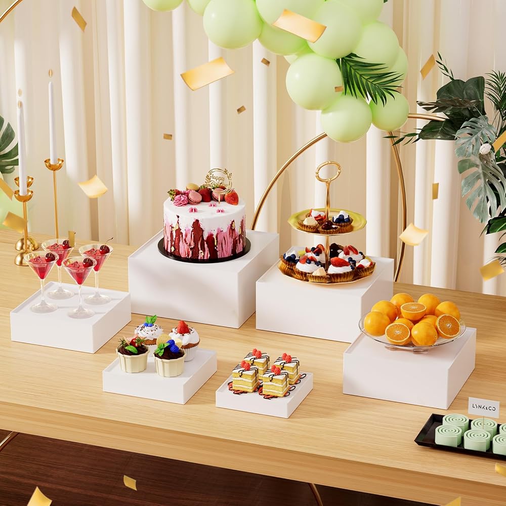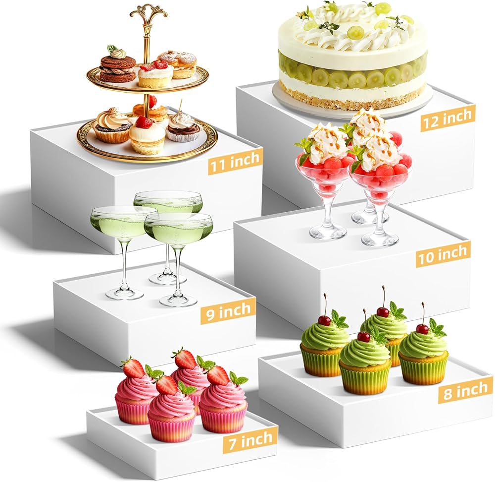 مجموعة حوامل عرض بوفيه كبيرة مكونة من 6 قطع مقاس 7 بوصة إلى 12 بوصة - رف عرض طاولة الطعام والحلوى من الأكريليك للحفلات، وتقديم الطعام، والمجوهرات، والمقتنيات، وصناديق تخزين مكعبة بيضاء