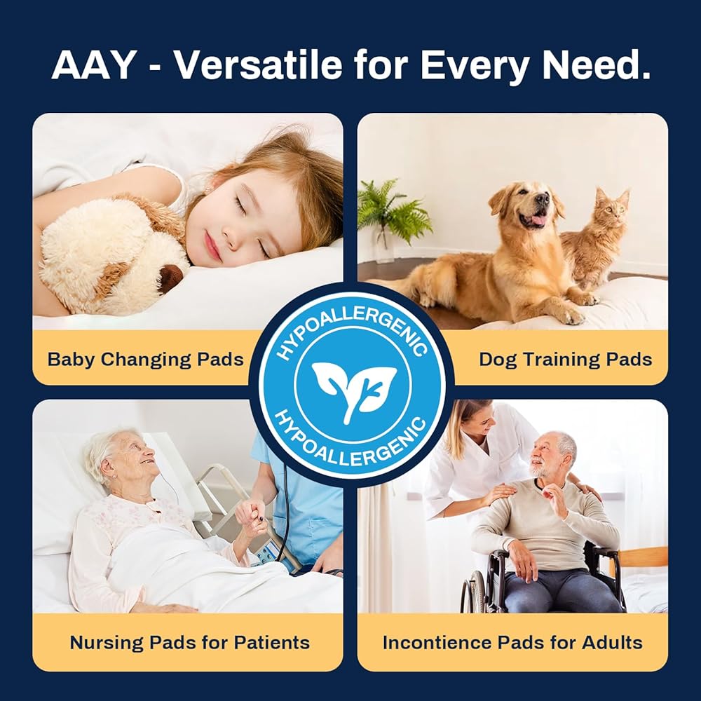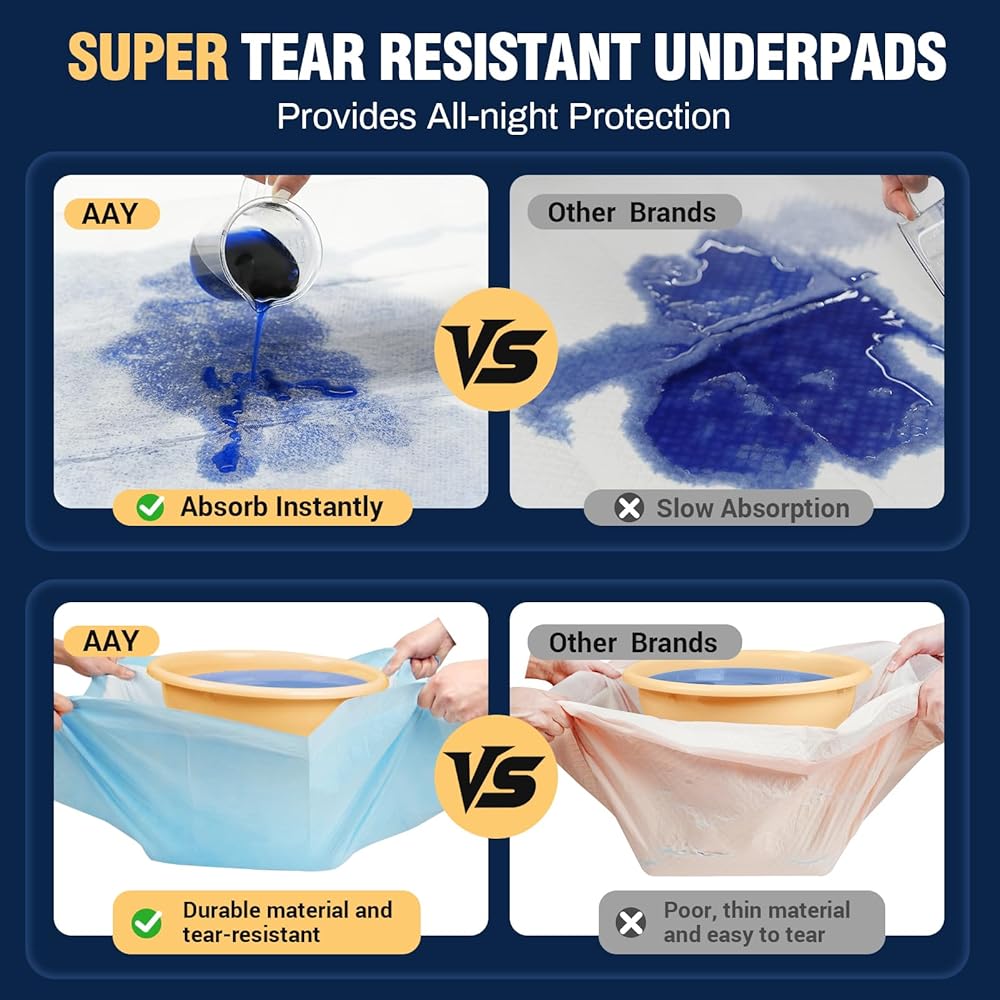 وسادات سرير للاستخدام مرة واحدة شديدة التحمل من AAY مقاس 91.44 سم × 111.46 سم (20 قطعة) وسادات سفلية داعمة من القماش مقاومة للتمزق، وسادات تبول كبيرة جدًا فائقة الامتصاص، وسادات تبول مقاومة للماء للبالغين وكبار السن والأطفال أو الجرو