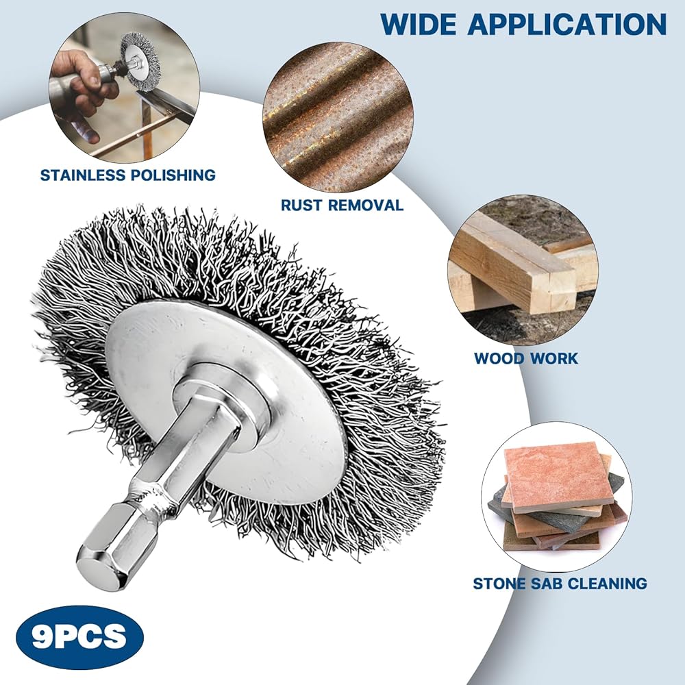 【9 Pieces Quality&Value Pack】These 1.5 inch stainless steel wire wheel drill attachments suitable for fast work on a large area, made of made of stainless steel fine wire and will not rust, which is well fixed and will not be lost, making the work more efficient and smooth.