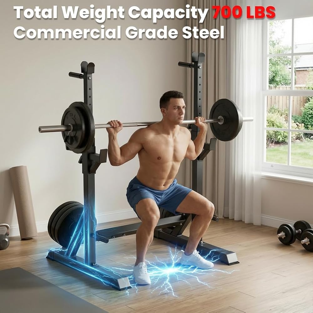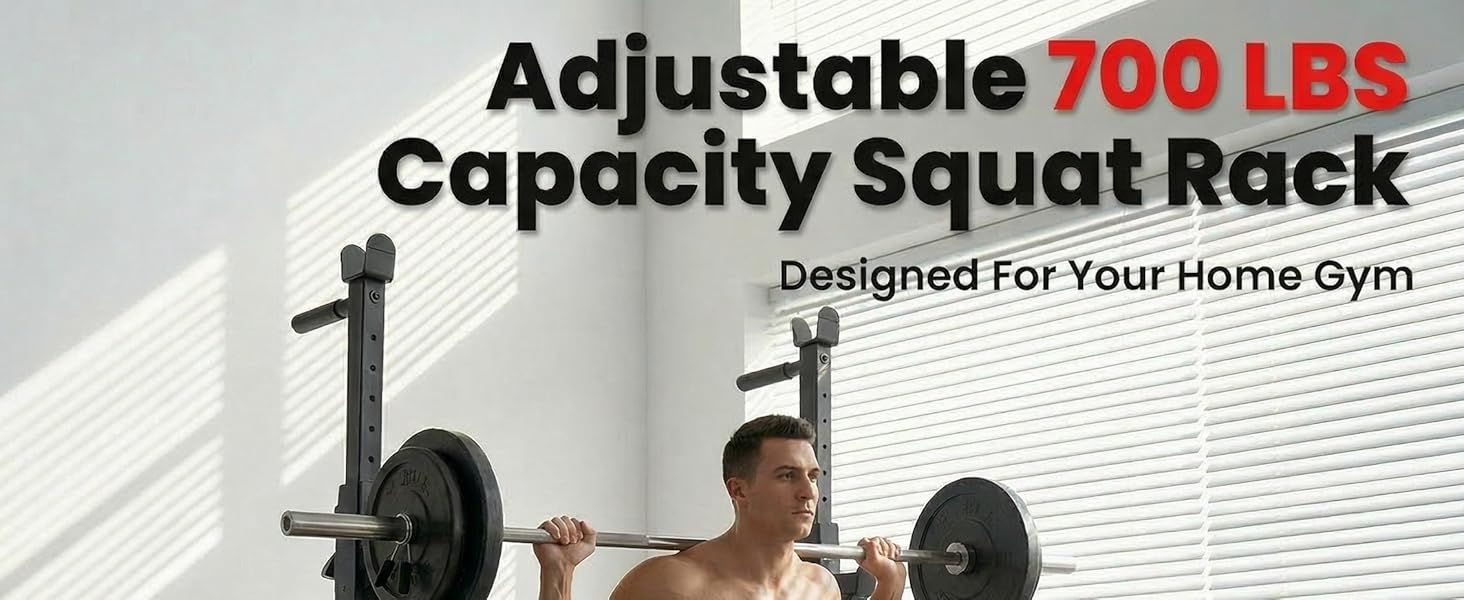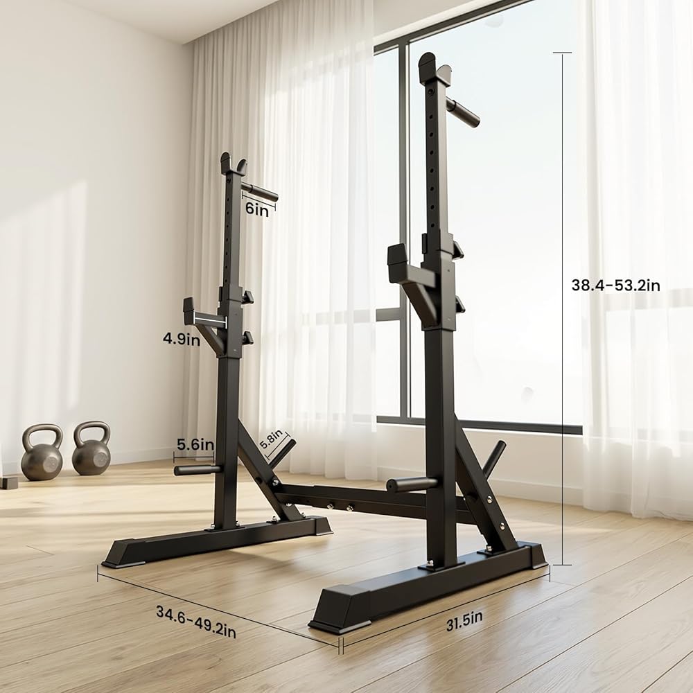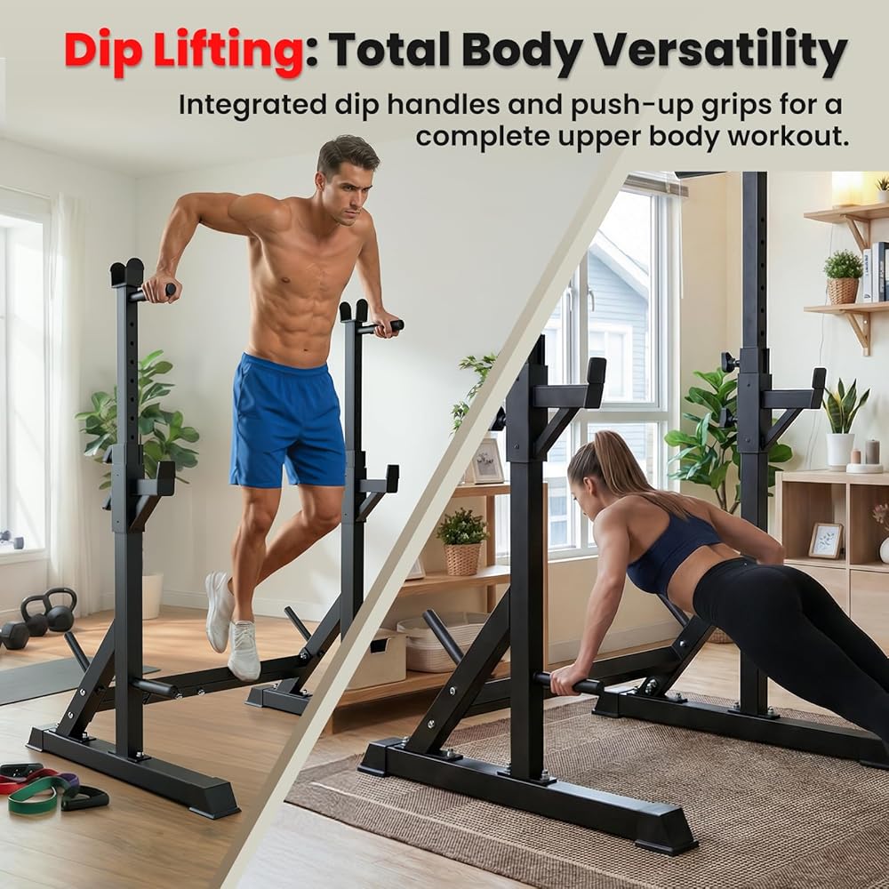حامل رف القرفصاء قابل للتعديل، حامل حديد عالي التحمل بوزن 700 رطل مع محطة غمس ومقابض رفع، عرض قابل للتعديل لقضبان بطول 6 أقدام و7 أقدام و8 أقدام - بنية تحتية لتدريب القوة في صالة الألعاب الرياضية المنزلية
