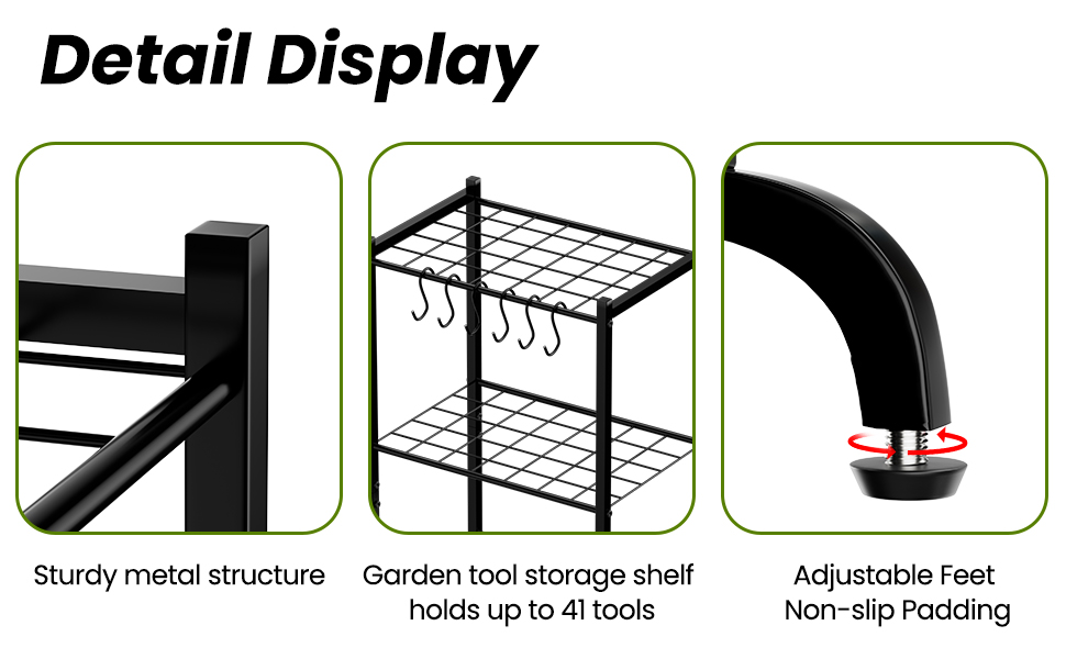 • سهولة التجميع: الهيكل البسيط إلى جانب الأجزاء المعبأة جيدًا والتعليمات المكتوبة جيدًا يجعلها سريعة وسهلة التركيب. لا حاجة لأي أدوات إضافية أو تركيب على الحائط، مما يجعله حل تخزين خالي من المتاعب. من أجل صلابة منظم أدوات الحديقة، فإن الأجزاء اليسرى واليمنى من التركيبات ملحومة في قطعة واحدة، لذلك تحتاج إلى إدخال الأجزاء العلوية والسفلية من الموصلات بإحكام وتثبيتها بمسامير عند التثبيت.