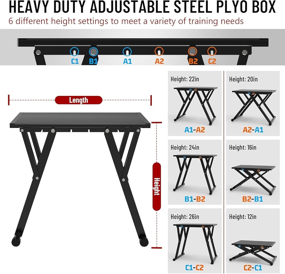 مستويات ارتفاع قابلة للتعديل: يمكنك التبديل بسهولة بين ستة إعدادات للارتفاع - 12 بوصة و16 بوصة و20 بوصة و22 بوصة و24 بوصة و26 بوصة - باستخدام أرجل قفل آمنة، مثالية للخطوات والقفزات الصندوقية ودوائر القوة