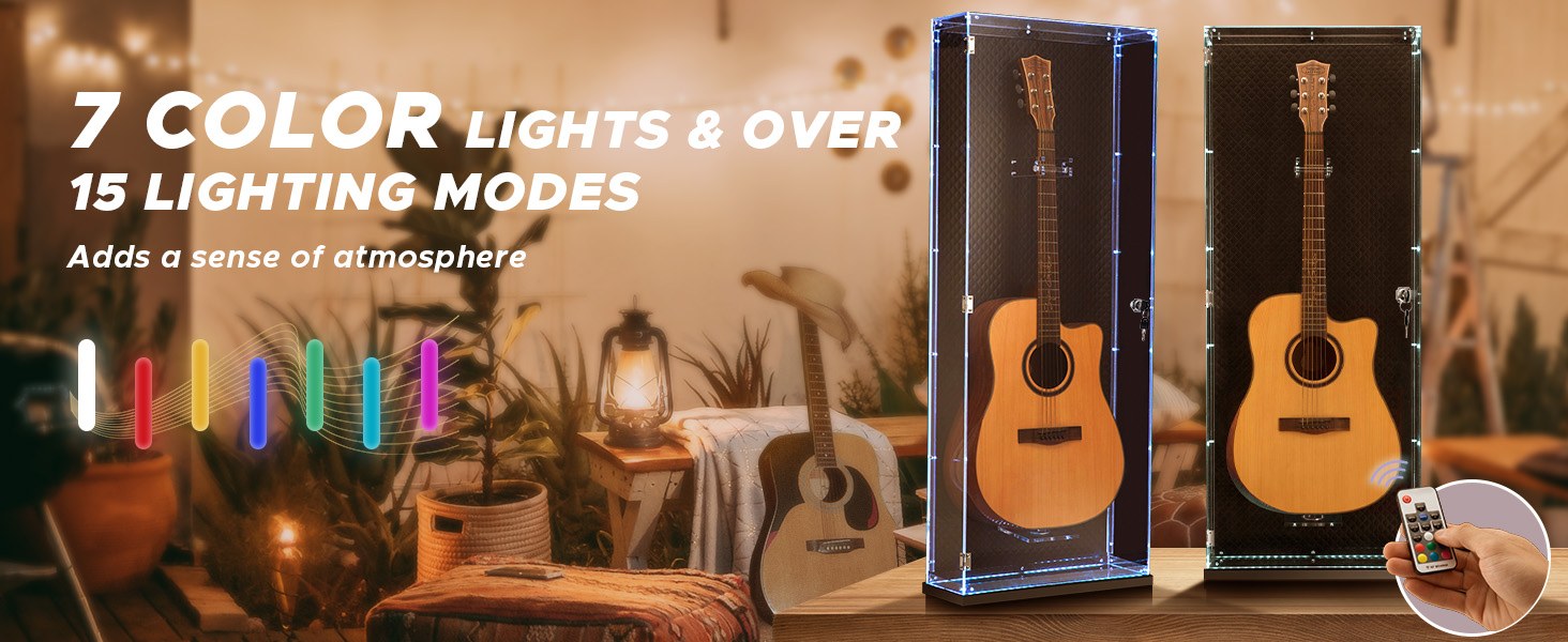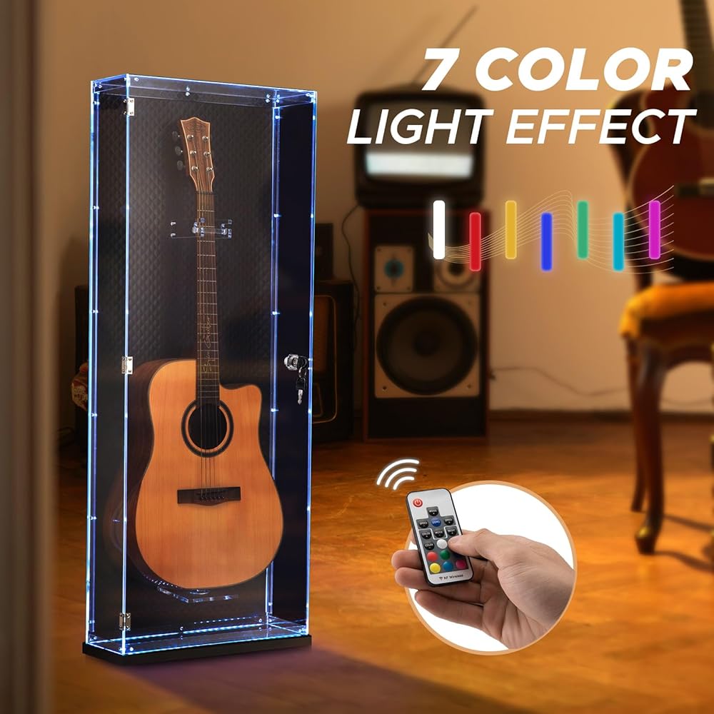 مصابيح LED مع جهاز تحكم عن بعد: تتميز خزانة تخزين الجيتار بأشرطة إضاءة LED على الجوانب الأربعة للقاعدة، وهي متوفرة في 7 ألوان. تضيء هذه الأضواء من خلال ألواح الأكريليك الشفافة، المحيطة بجيتارك في توهج مشع. مع أكثر من 15 وضعًا، يمكنك اختيار مجموعة ألوان فردية أو متعددة وضبط السطوع والسرعة لتناسب تفضيلاتك