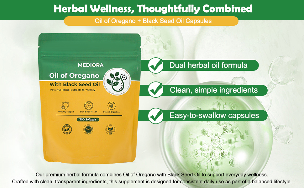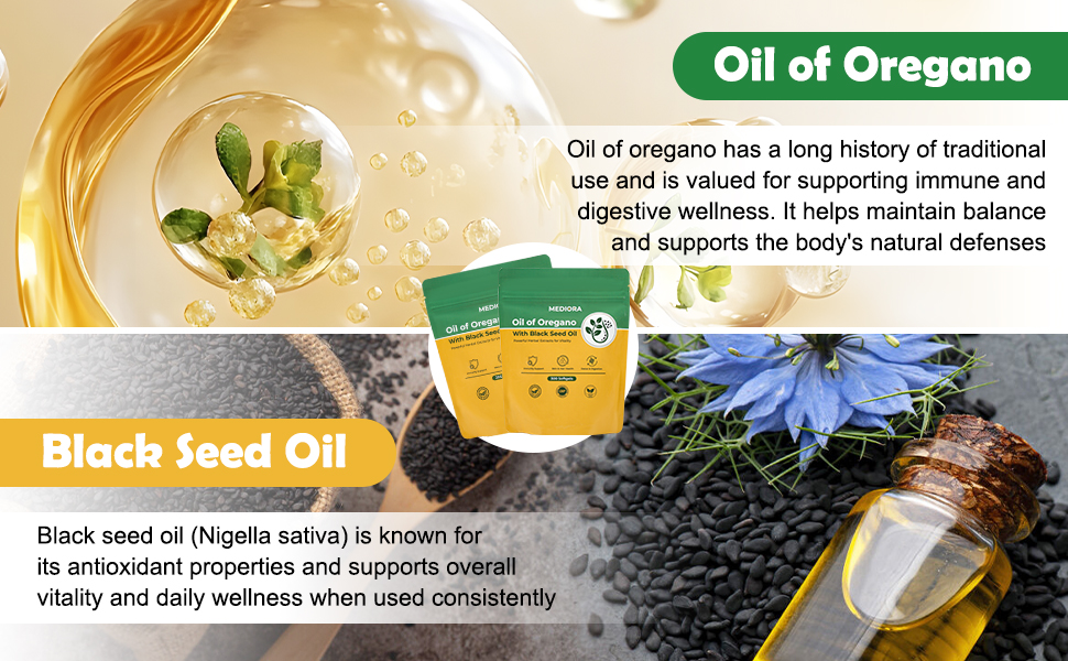 • كبسولات هلامية معززة الامتصاص: كبسولات هلامية من زيت الحبة السوداء بزيت الأوريجانو الممتاز سهلة البلع ومصممة لامتصاص أفضل للمغذيات القابلة للذوبان في الدهون، دون المذاق القاسي لزيت الأوريجانو السائل.