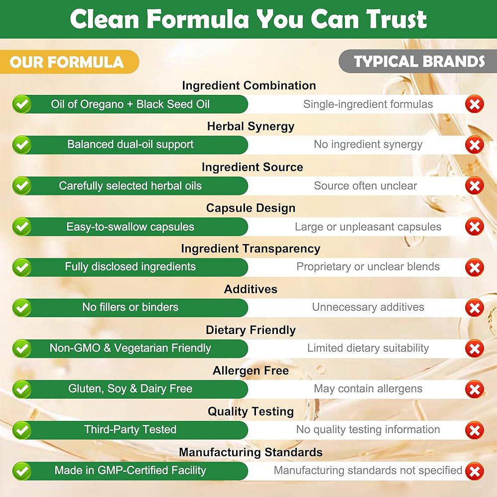 • جودة نظيفة وموثوقة: كبسولات زيت الأوريجانو وزيت الحبة السوداء عالية الجودة مصنوعة من مواد غير معدلة وراثيًا وخالية من الصويا ومنتجات الألبان والغلوتين والمواد المالئة. تم اختباره في معمل تابع لجهة خارجية من حيث النقاء والسلامة والفعالية.