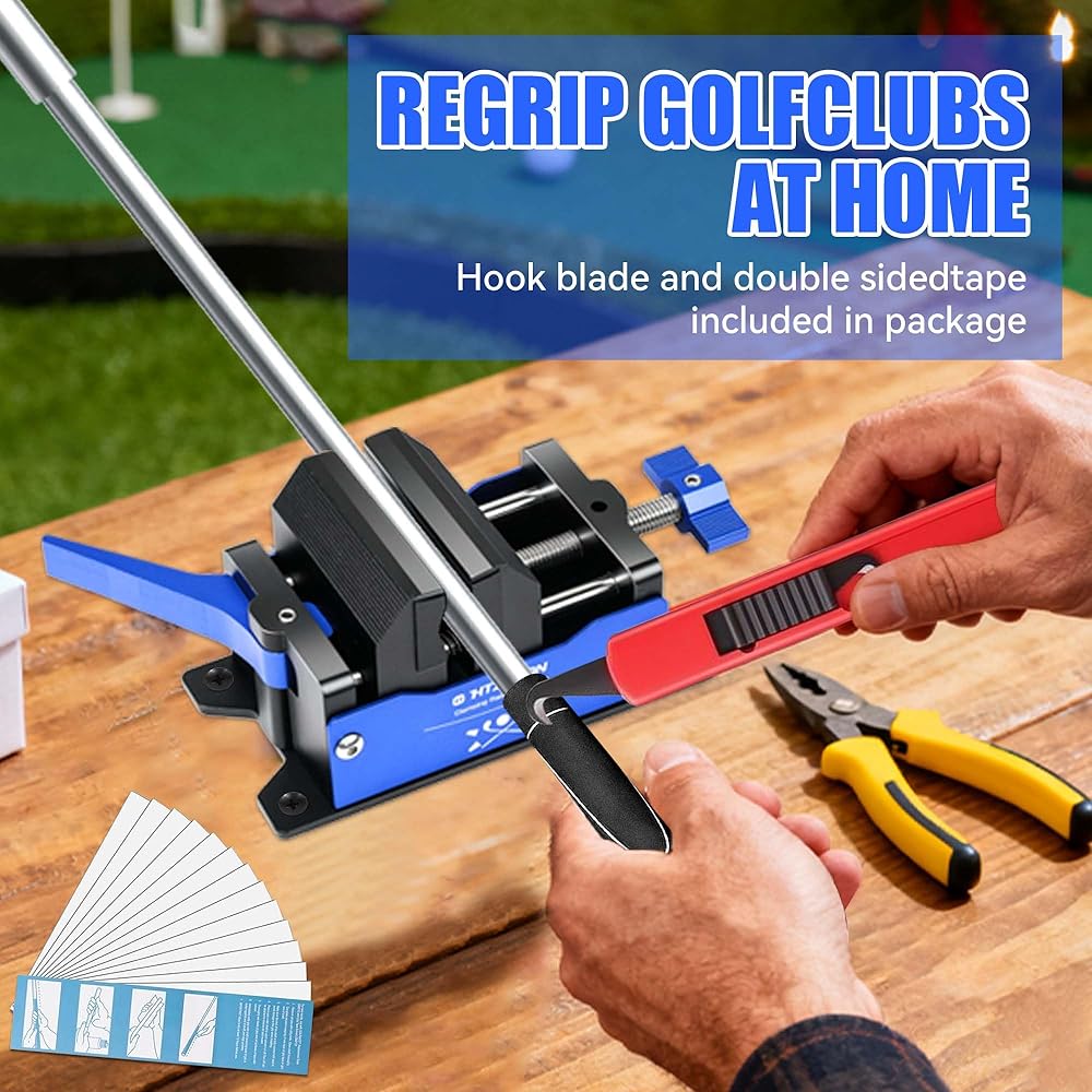 مجموعة أدوات إعادة الإمساك بالجولف مع شريط بديل، وسكين الخطاف (بدون مذيب)، وملزمة نادي الجولف لإعادة الإمساك، ومشبك الملزمة المنزلية سريع الفك، والألومنيوم