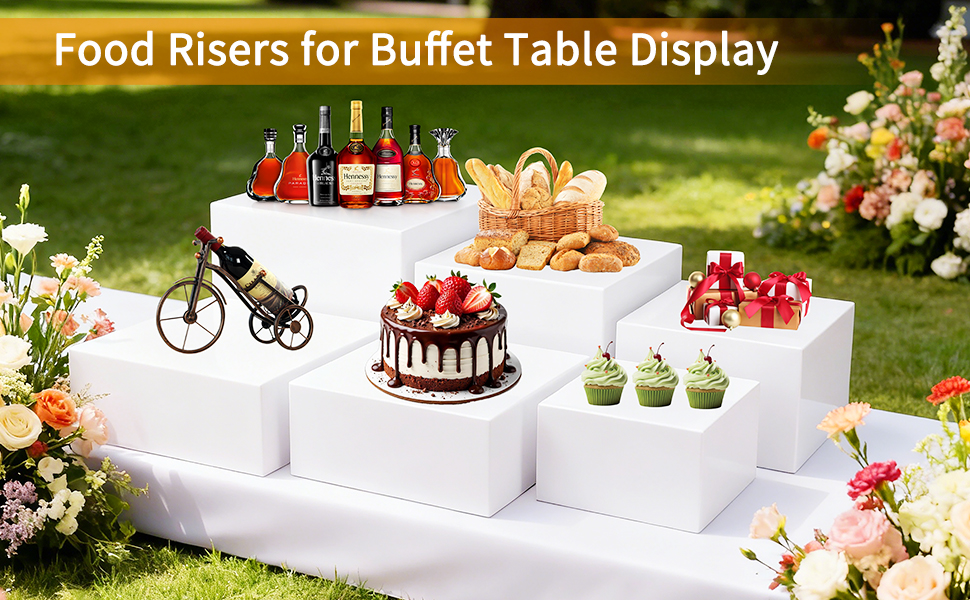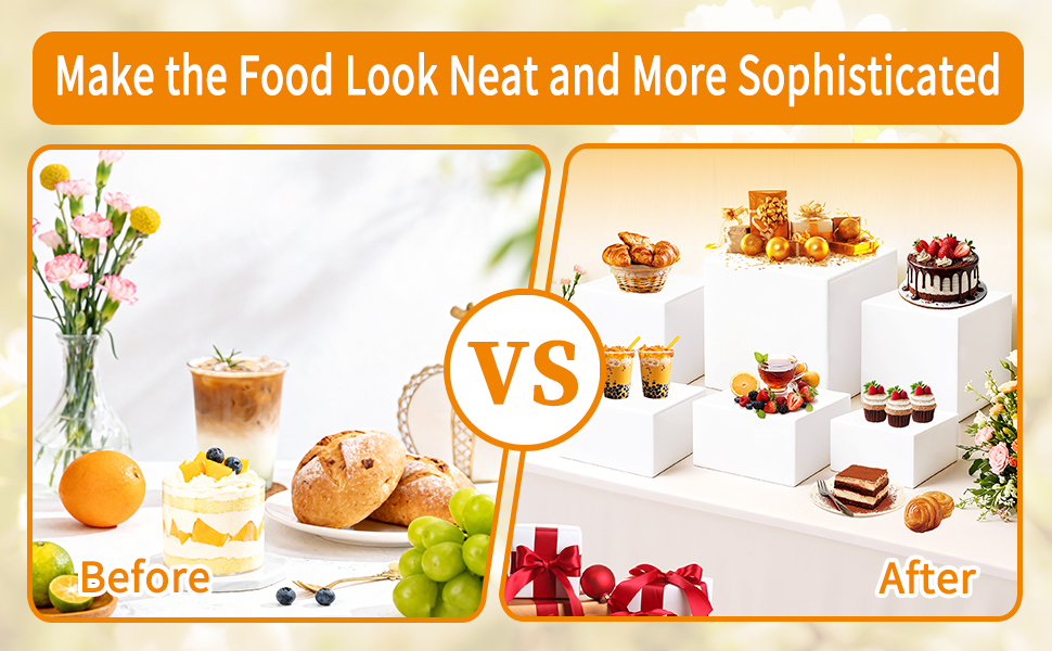 【مجموعة واسعة من السيناريوهات】تتميز رافعات العرض المكعبة المصنوعة من الأكريليك بتصميم بسيط، ومناسبة لمجموعة متنوعة من المشاهد، ويمكن وضع الحلويات والمشروبات في التجمعات العائلية، مما يضيف المتعة؛ يمكن لولائم العمل عرض وجبات الطعام والمشروبات، وإظهار الاحتراف؛ حفلات الزفاف كمنطقة عرض للضيوف لتقديم تجربة أنيقة؛ يمكن للأنشطة المجتمعية والاحتفالات المدرسية والمناسبات الأخرى أيضًا تلبية احتياجات عرض الطعام والوصول إليه، وهو مريح وعملي