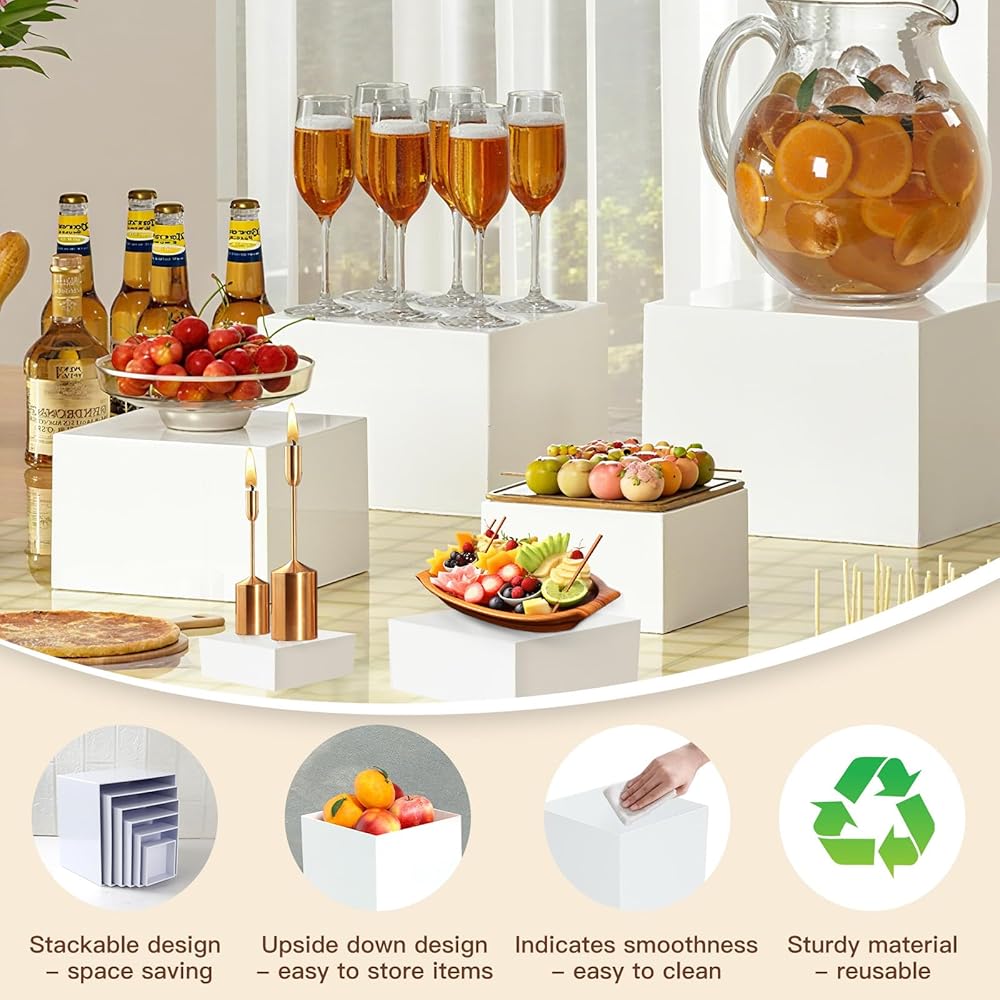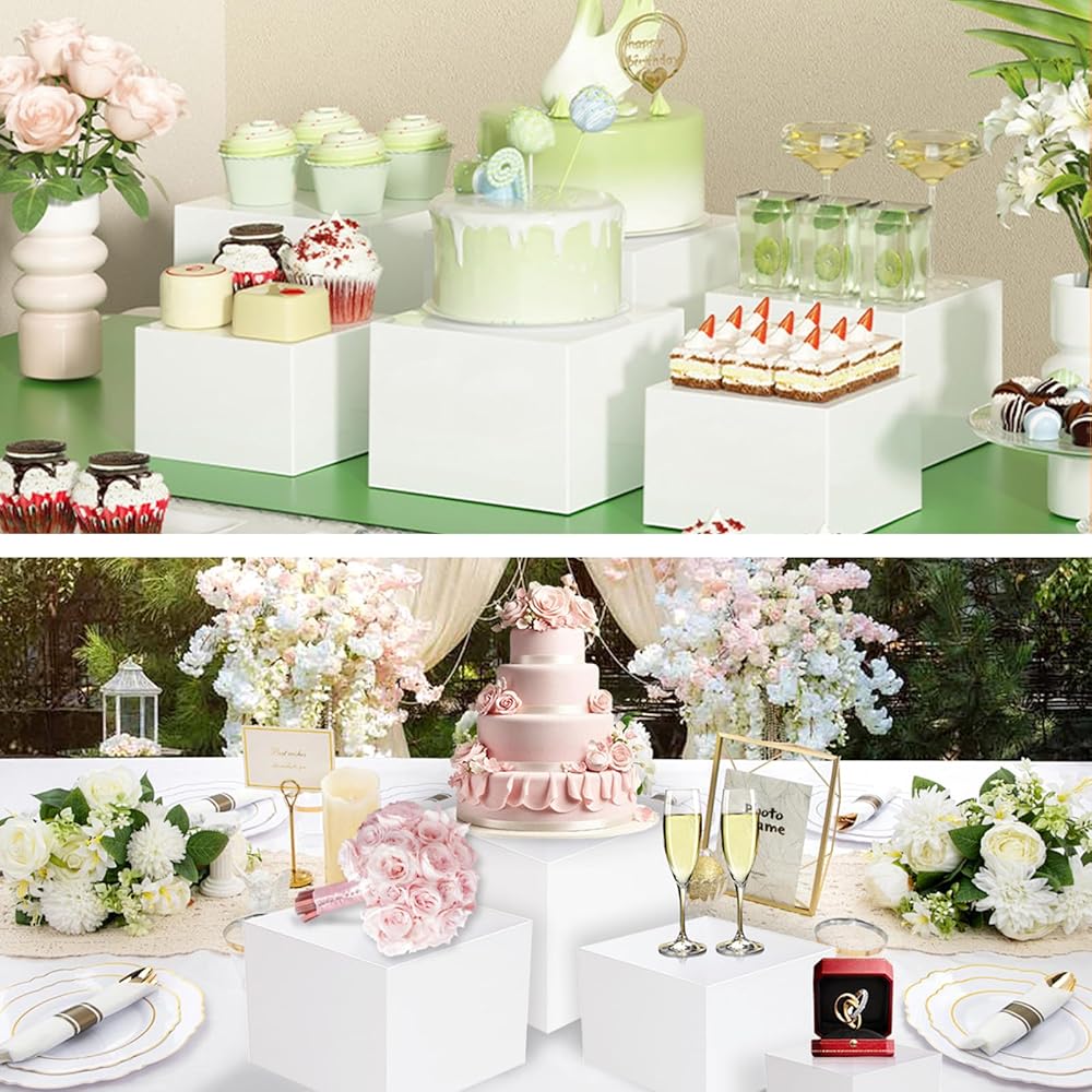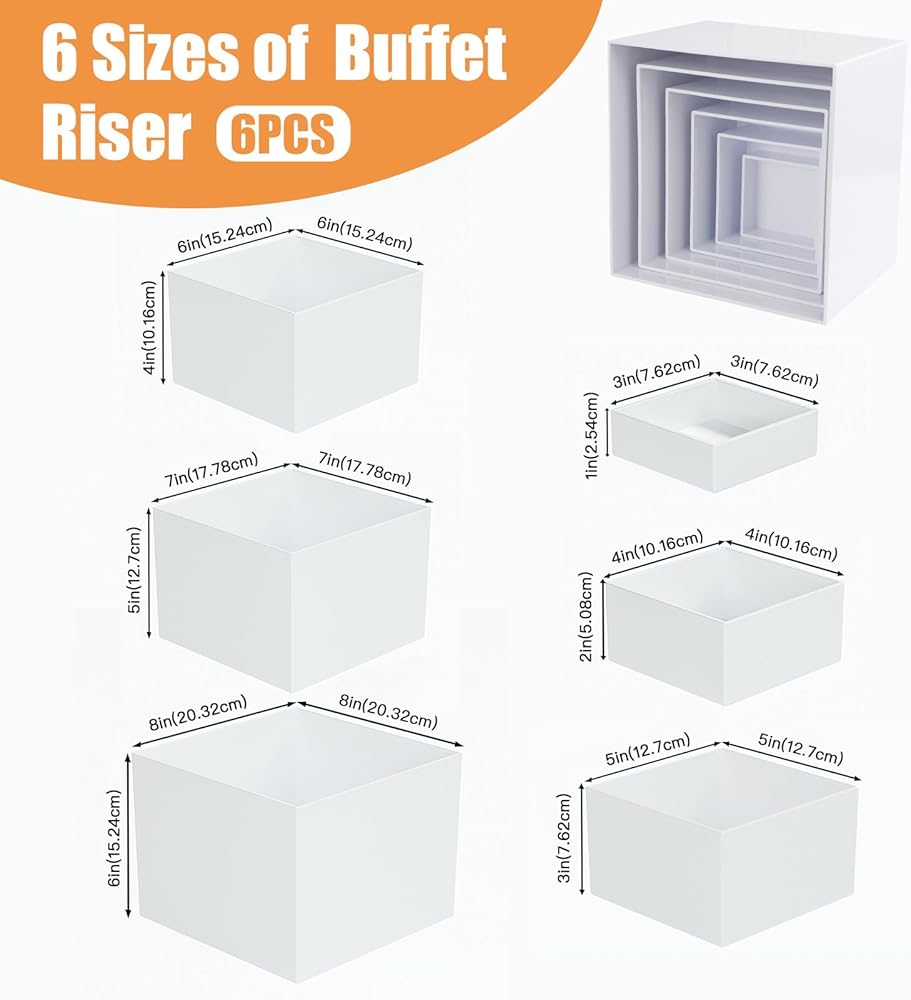 مجموعة رافعات البوفيه مكونة من 6 قطع، رافعات طعام أكريليك لطاولة البوفيه، مجموعة حامل عرض أبيض مع قيعان مجوفة، صناديق مكعبة لحفلات تقديم الكعك والحلوى (3 بوصة، 4 بوصة، 5 بوصة، 6 بوصة، 7 بوصة، 8 بوصة) هدية عيد الميلاد