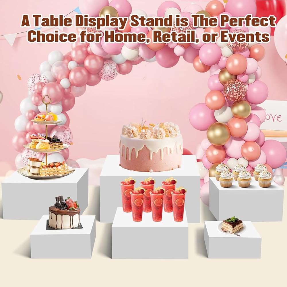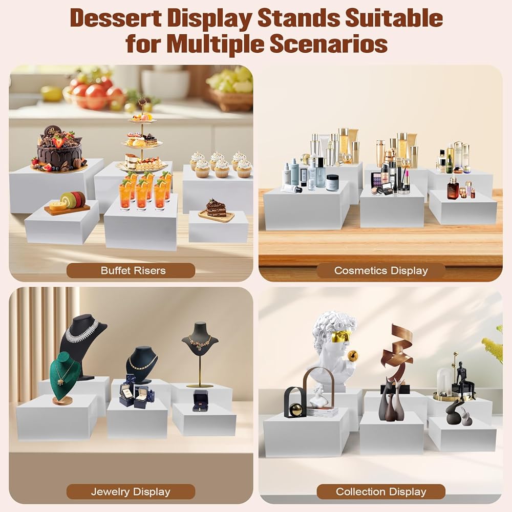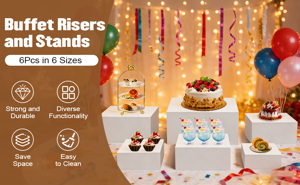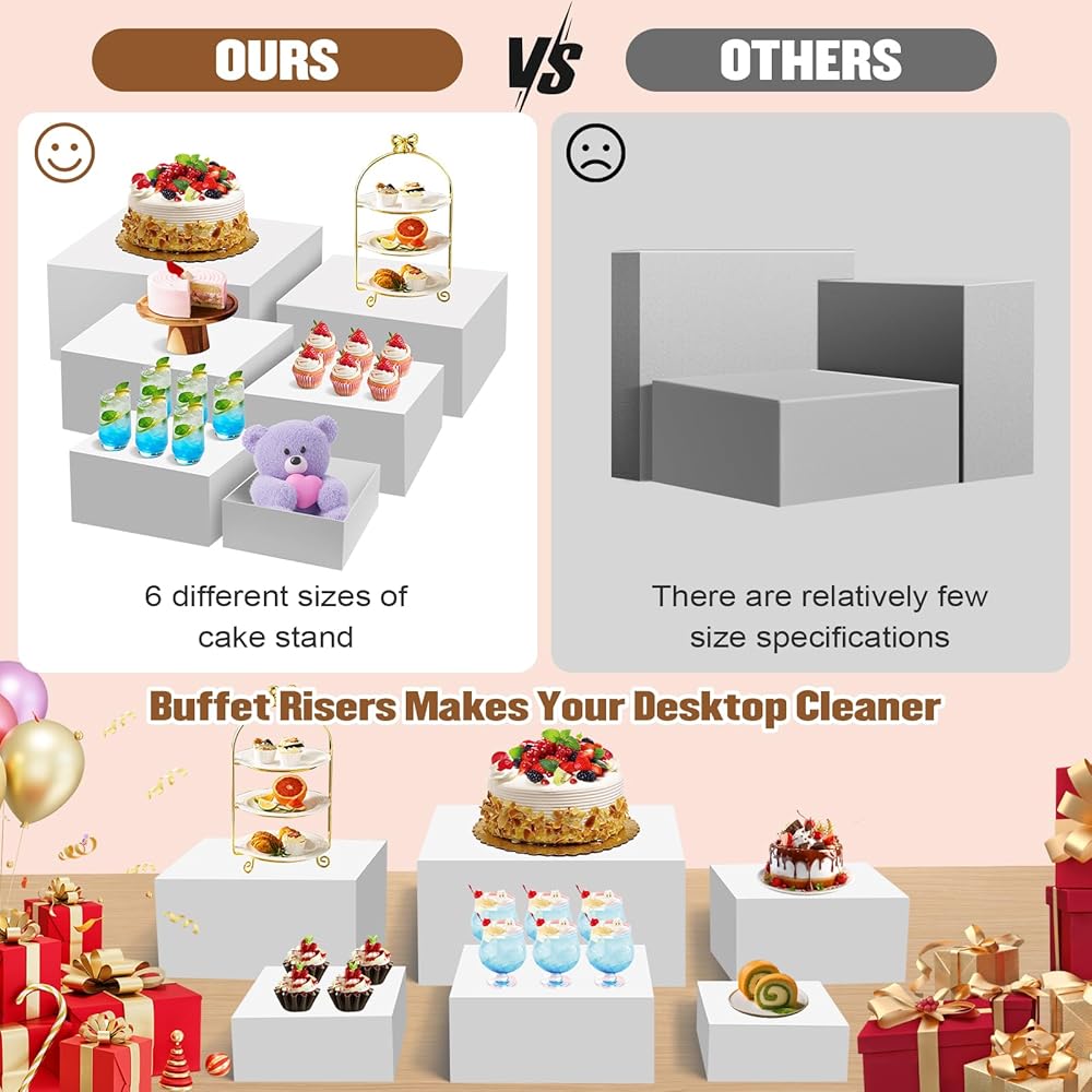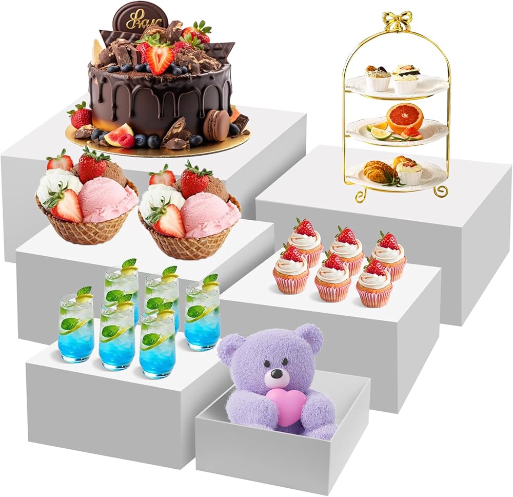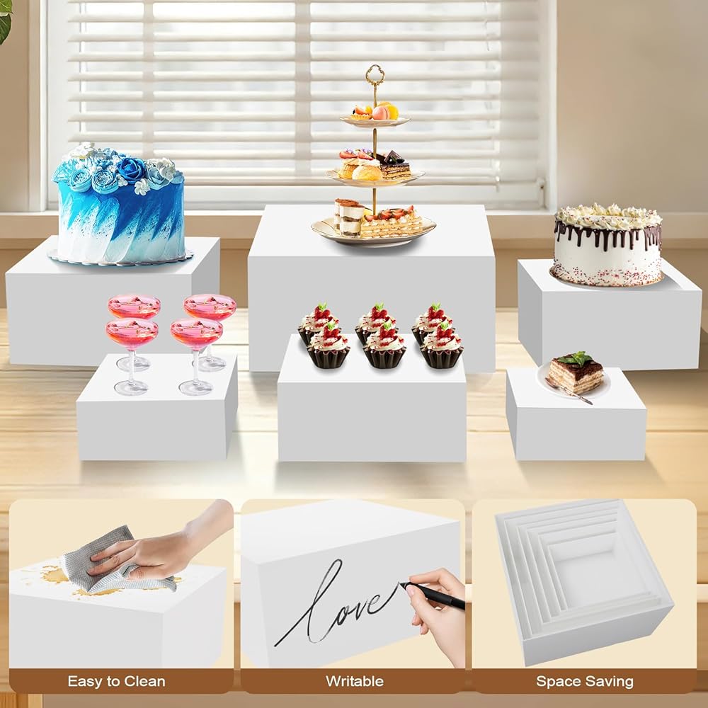مجموعة عرض طاولة الحلوى بمقاسات متعددة: تأتي رافعات وحوامل البوفيه هذه في 6 أحجام متدرجة دقيقة (7×7×3 بوصة، 8×8×4 بوصة، 9×9×2 بوصة، 10×10×3 بوصة، 11×11×4 بوصة، 12×12×6 بوصة)، تتوافق تمامًا مع كل شيء بدءًا من الكعك الصغير والحلويات إلى الكعك مقاس 12 بوصة. حامل الكيك لا يحتاج إلى ملحقات إضافية لإنشاء طاولة حلوى متطورة بارتفاعات مختلفة بسرعة، مما يجعل شاشتك مميزة في الحفلات أو شاي بعد الظهر أو المعارض.