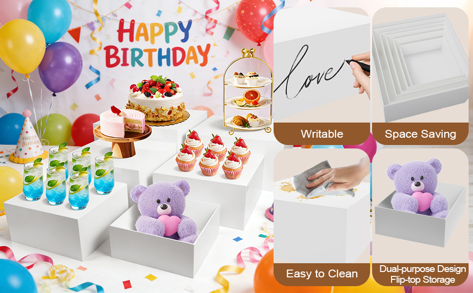 تصميم بسيط وأنيق: رافعات عرض الطعام ذات الشكل المكعب البسيط للحفلات تضفي الأناقة. لا يعزز لونها الأبيض الفاخر من تطور الحلويات فحسب، بل يندمج أيضًا بسلاسة في مختلف الإعدادات مثل ديكور المنزل والحفلات وقاعات العرض. تعمل حوامل عرض الحلوى كمنصة عرض لافتة للنظر ويمكن استخدامها أيضًا كصندوق تخزين دقيق للأشياء الصغيرة مثل منتجات العلاج العطري والصناديق العمياء ومستحضرات التجميل، مما يؤدي بسهولة إلى رفع الجمالية العامة لأي إعداد.