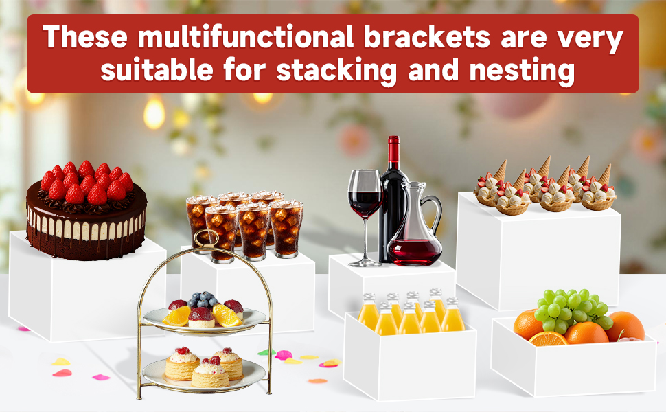 تصميم متداخل 2 في 1 متعدد الاستخدامات: تتميز حوامل العرض متعددة الوظائف هذه بتصميم متداخل للتخزين الموفر للمساحة. استخدمها كحامل طعام لحفلات العرض، أو أدوات رفع الحلوى، أو منظمات المجوهرات، أو العروض القابلة للجمع. خفيفة الوزن، وسهلة التنظيف، ومثالية لأي طاولة بوفيه، أو حفلة، أو زفاف، أو مناسبة تقديم الطعام