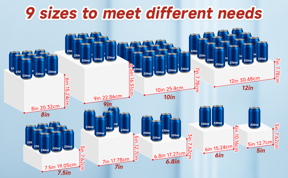 تذكير مهم بالمقاس: يرجى التحقق مرة أخرى من مواصفات المقاس قبل الطلب للتأكد من أنها تلبي احتياجات العرض الخاصة بك. نحن نقدم 3 مجموعات مقاسات لتختار من بينها: صغير (5"، 6"، 6.8"، 7"، 7.5"، 8 بوصة)، متوسط (6"، 7"، 7.5"، 8"، 9"، 10 بوصة)، كبير (8"، 9"، 10"، 12 بوصة). تُعد رافعات العرض الأكريليك الخاصة بنا مثالية لطاولات البوفيه وتقديم الطعام، مما يساعدك على تجنب مشكلات الحجم وإنشاء عرض بوفيه نظيف واحترافي لأي حدث.