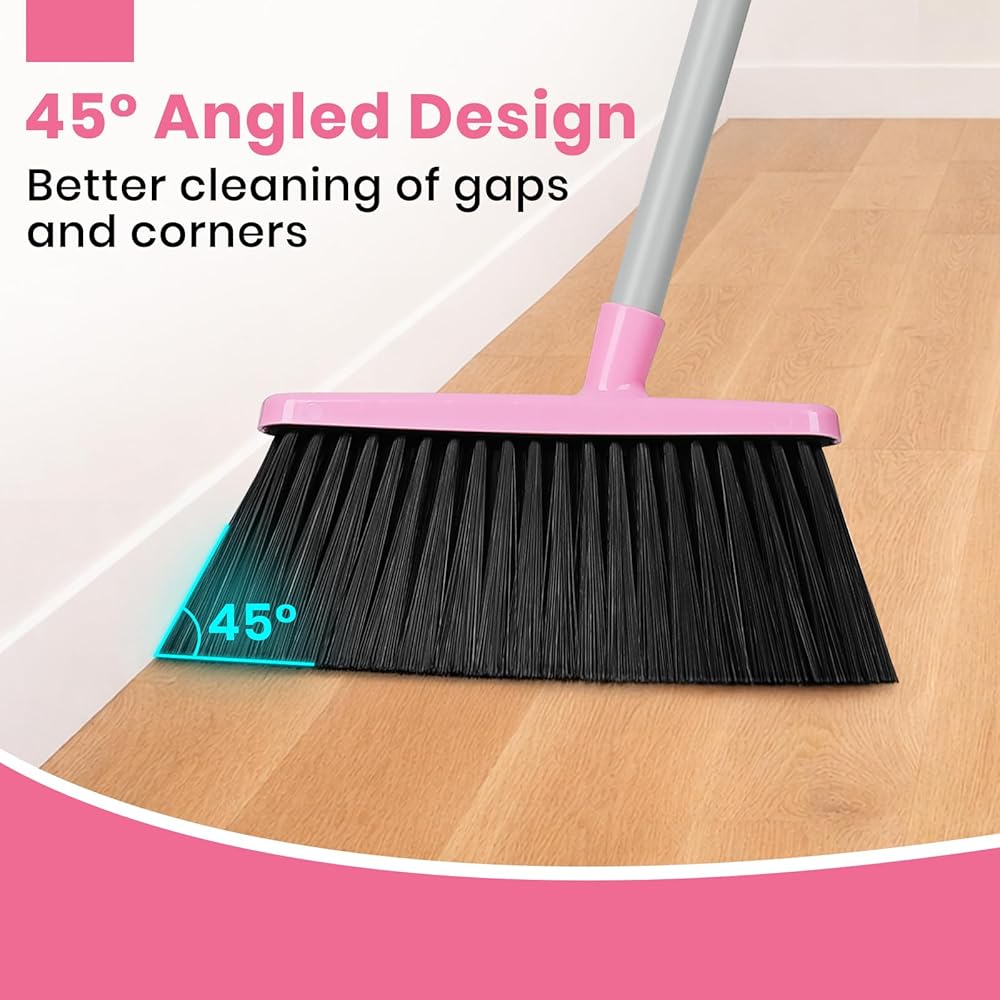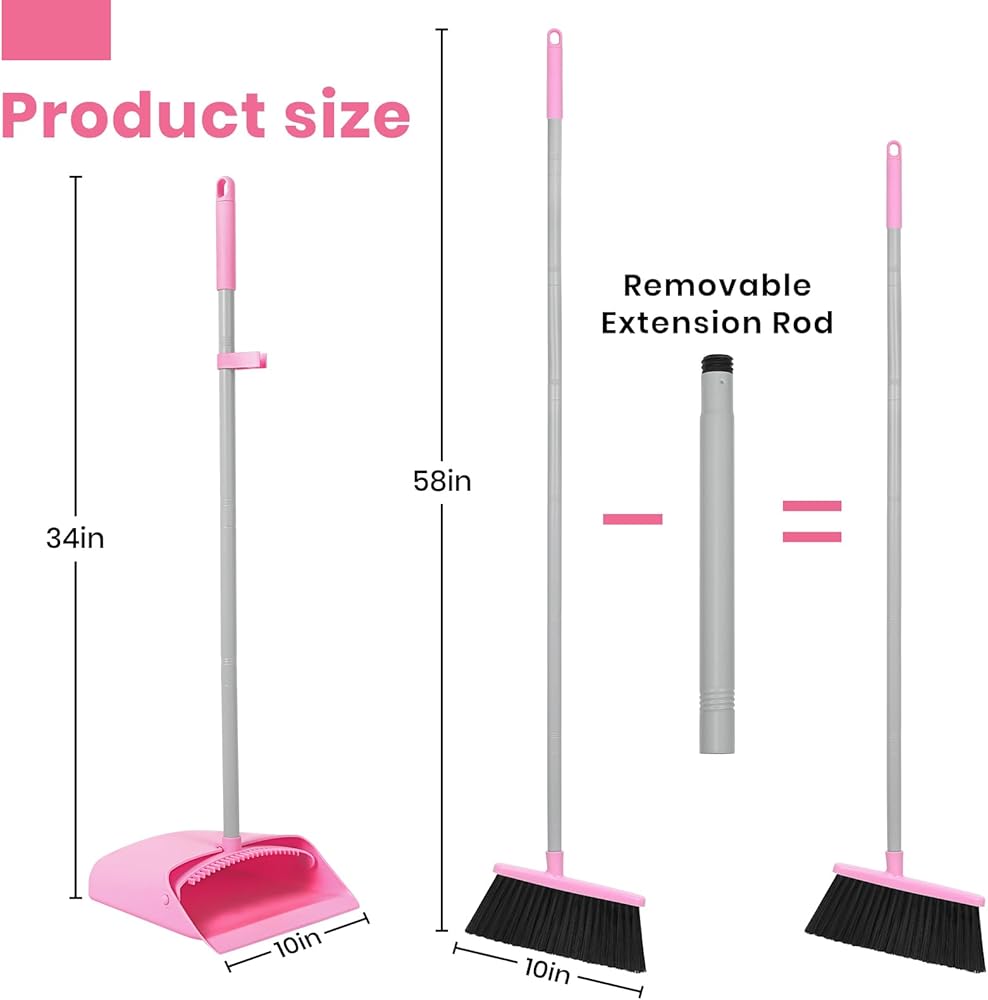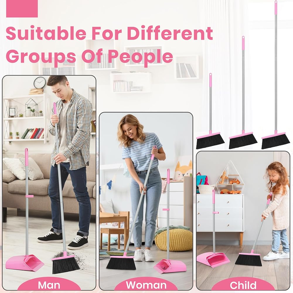 مجموعة مكنسة ومجارف وردية، مكنسة صغيرة بمقبض طويل قابل للتعديل مقاس 58 بوصة مع مجموعة كومبو من مجرفة الوقوف مع أسنان وعاء الغبار، لتنظيف أرضية المكتب المنزلي الداخلي