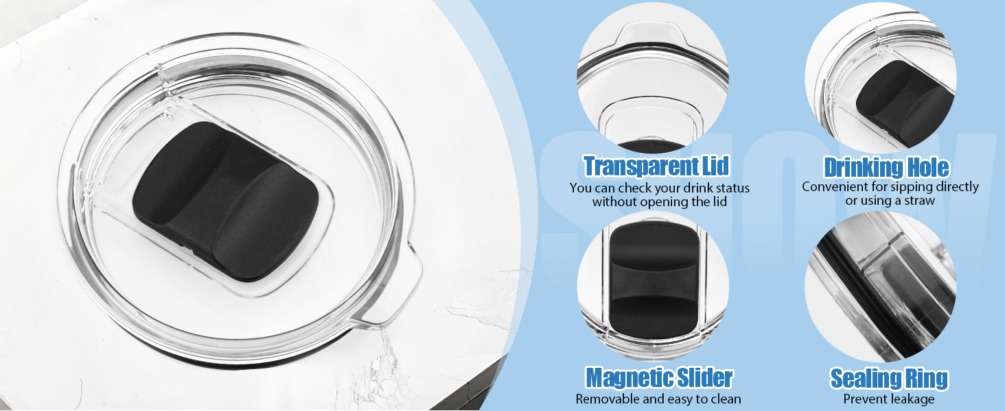 يتناسب الغطاء جيدًا مع كوب ييتي سعة 20 أونصة، ومكاييل سعة 16 أونصة، وكوب سعة 10/24 أونصة، وكرة منخفضة سعة 10 أونصة، وأوزارك تريل، وآرتيك ذات الطراز القديم وغيرها من الأكواب ذات العلامات التجارية بنفس الحجم. يسمح لك الغطاء الشفاف برؤية كمية المشروب المتبقية مباشرة دون الحاجة إلى فتح الغطاء.