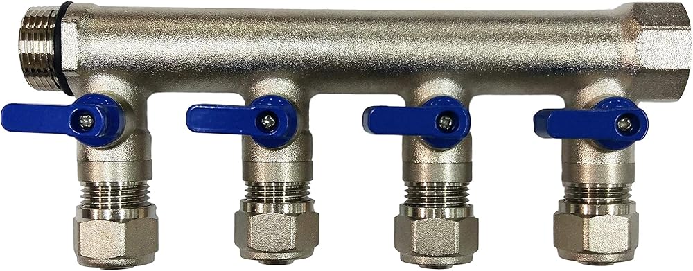4 Loop Plumbing Manifold w/ 1" trunk & 1/2" pex ball valves, blue handle