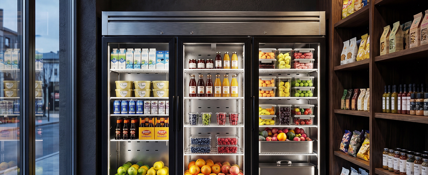أبواب زجاجية معززة: 3 أبواب زجاجية متينة منخفضة الانبعاث توفر رؤية واضحة للمنتج قبل فتح ثلاجة العرض، وتحبس درجات الحرارة الثابتة، وتحجب الضوء القاسي لإبطاء فقدان المغذيات الغذائية وتقادم التغليف، والحفاظ على النضارة لفترة أطول. تعمل الأقفال المدمجة على تعزيز سلامة الطعام، بينما يضيف التصميم ذاتي الإغلاق الراحة وتسمح وظيفة البقاء مفتوحة بزاوية 105 درجة بسهولة التحميل والتفريغ