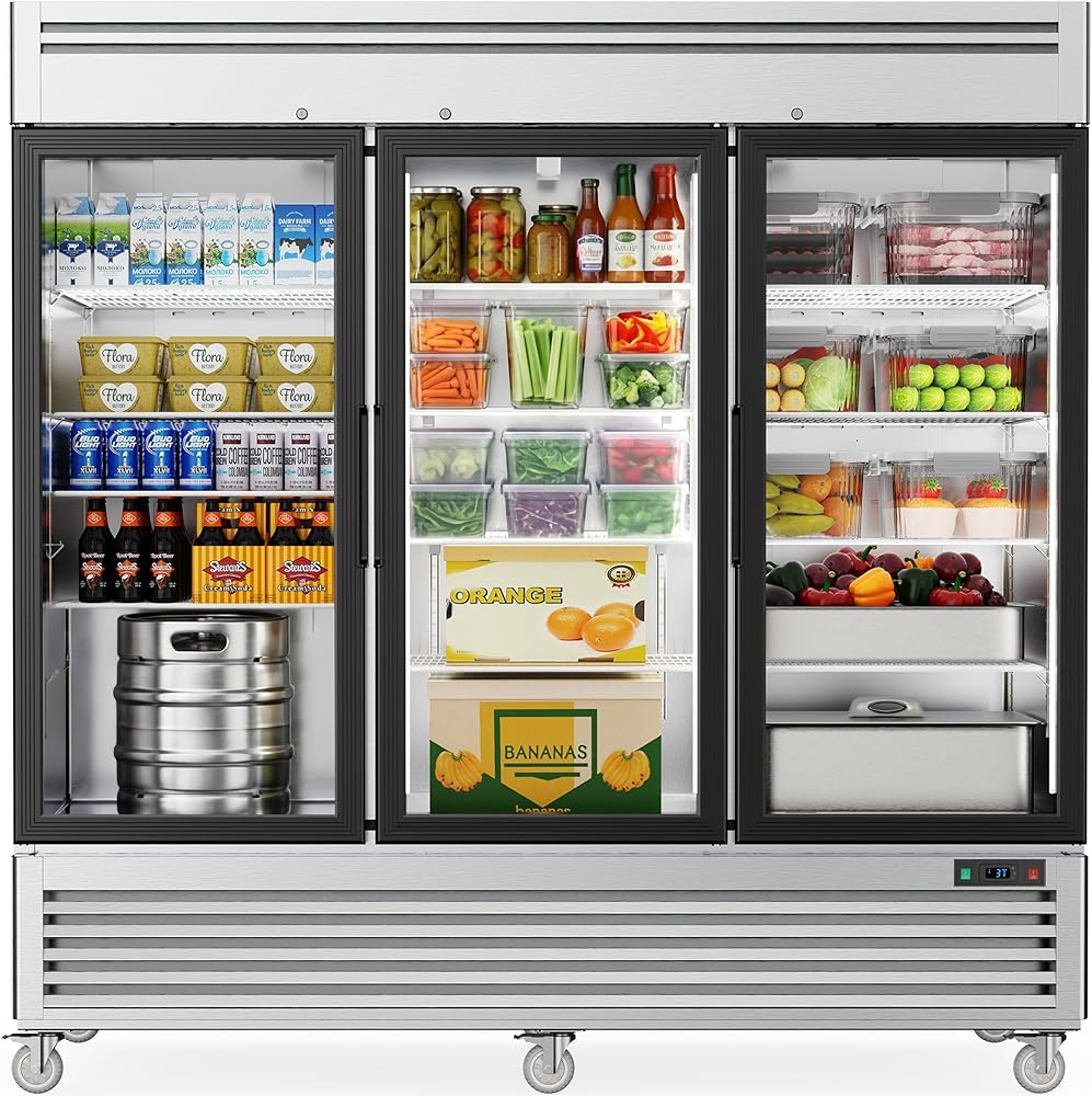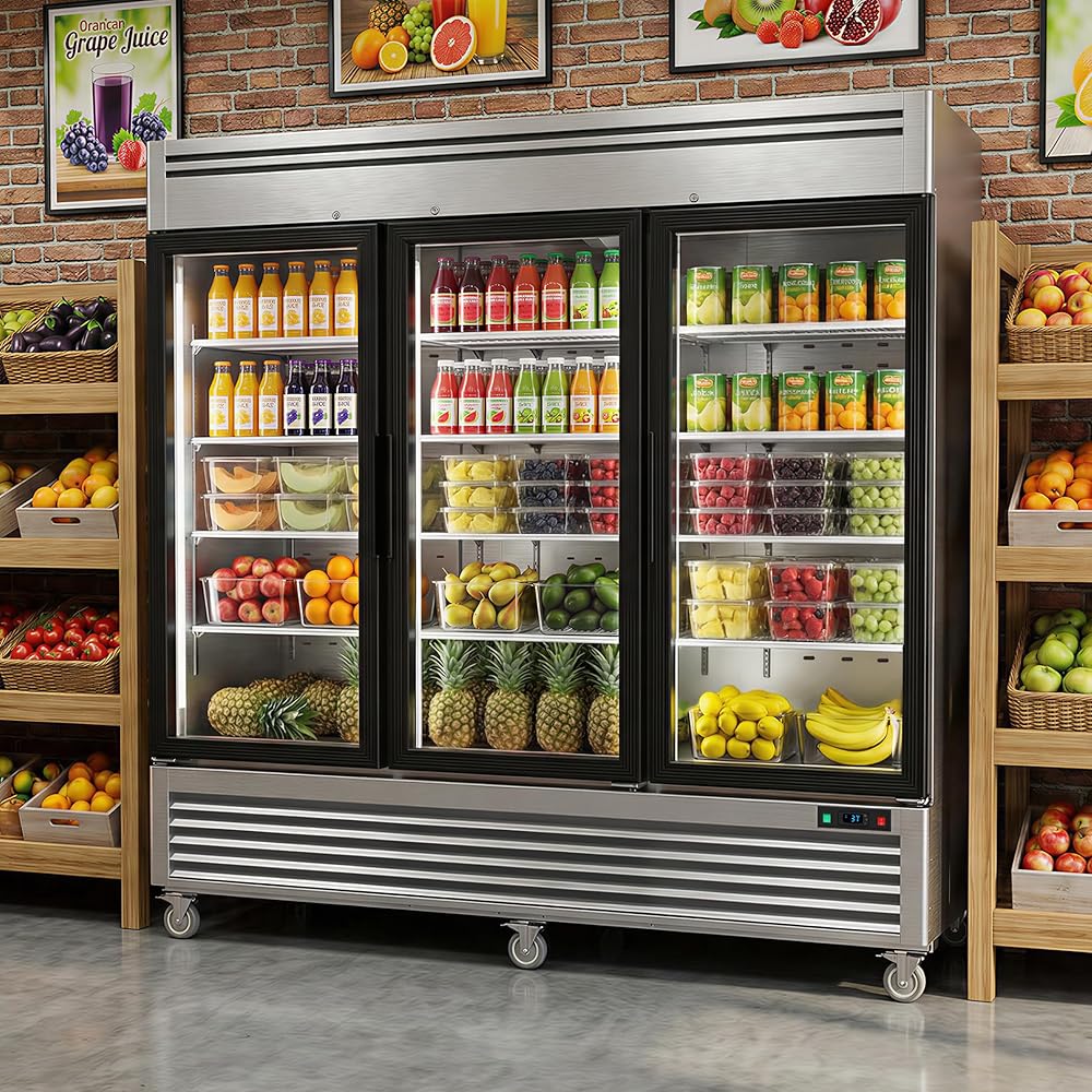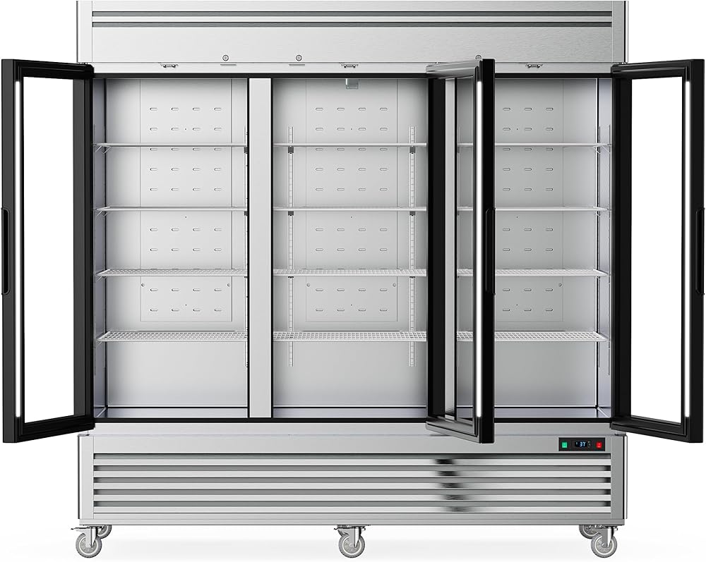Coolake 82 "ثلاجة تجارية 3 أبواب زجاجية، 72 قدم مكعب من الفولاذ المقاوم للصدأ يمكن الوصول إليها في ثلاجة التاجر المستقيمة، 33 درجة فهرنهايت ~ 41 درجة فهرنهايت ثلاجة عرض تبريد لمطعم مقهى الفندق منطقة إعداد المطبخ
