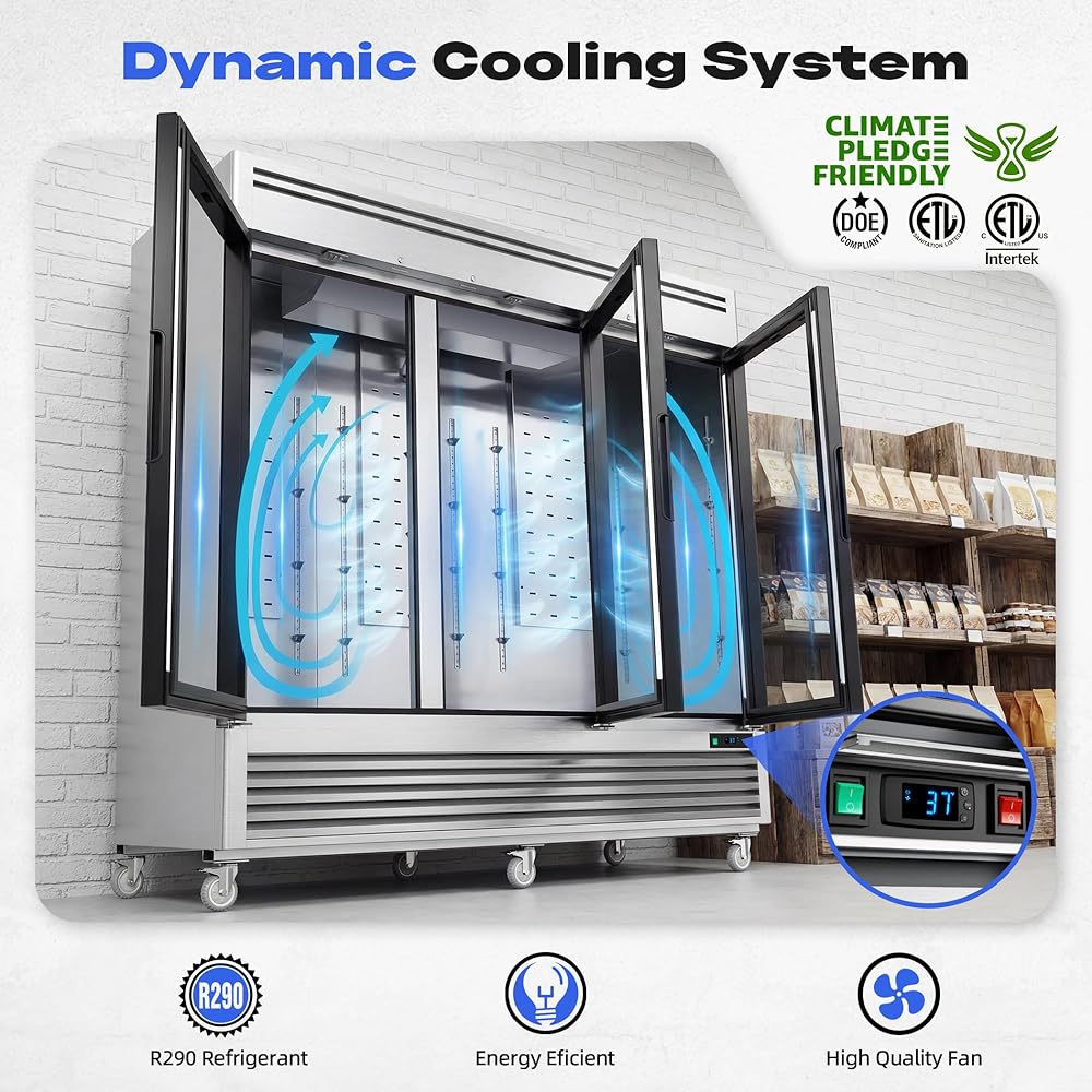 فعالة وعملية: تتميز هذه الثلاجة ذات الباب الزجاجي التجاري بضاغط عالي الأداء لتبريد قوي وموفر للطاقة وتشغيل فعال. يعمل نظام التبريد المثبت في الأسفل والرف المرتفع على قطع الانحناء عند الوصول إلى الطعام، مما يؤدي إلى تبسيط عملية الاسترجاع والصيانة. يعمل التخزين العلوي الإضافي على زيادة كفاءة المساحة، وتضمن إضاءة LED الساطعة رؤية واضحة حتى في الإضاءة المنخفضة