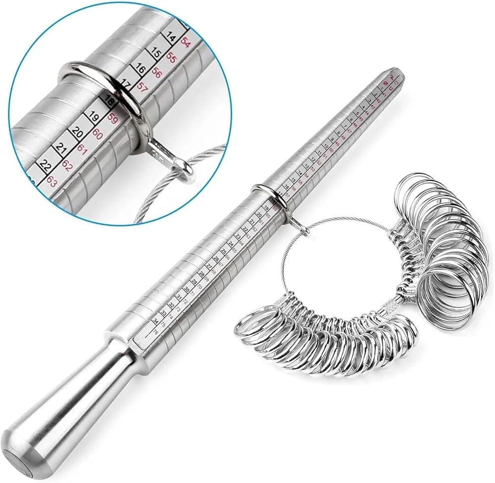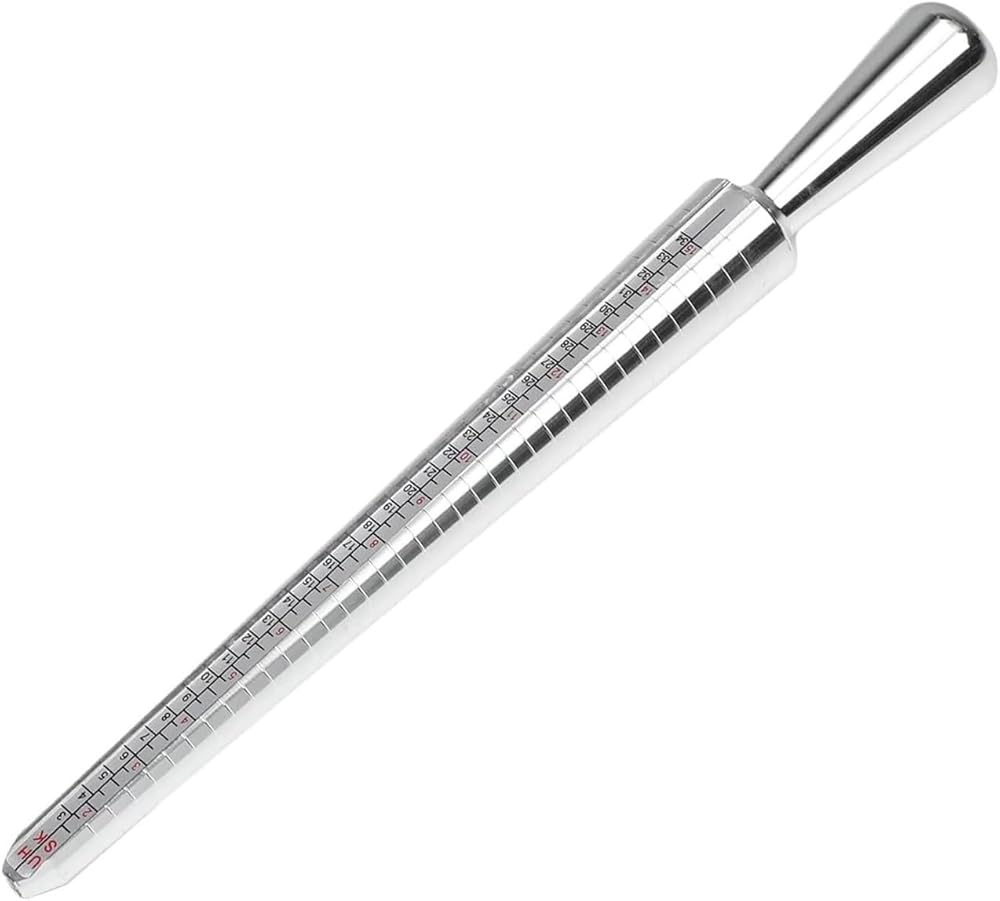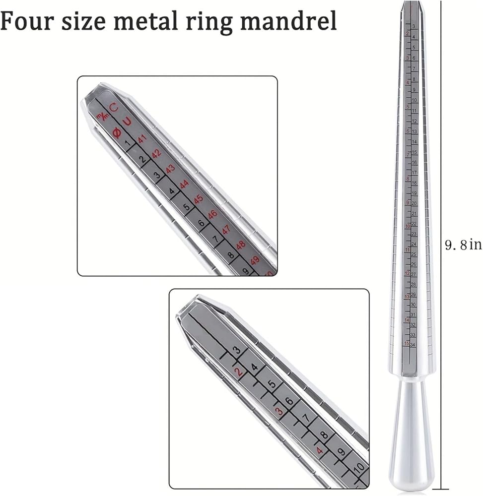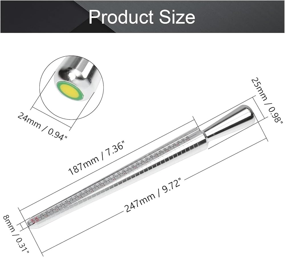 Easy to read size chart on mandrel for full sizes, with line marks on shaft to keep the ring in level when measuring.