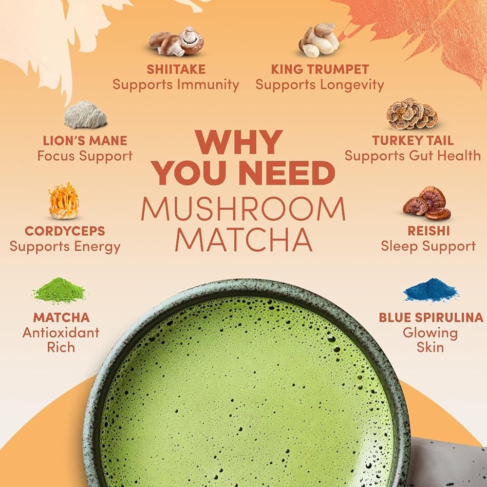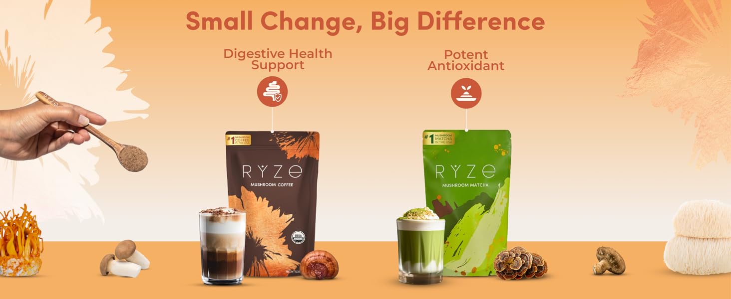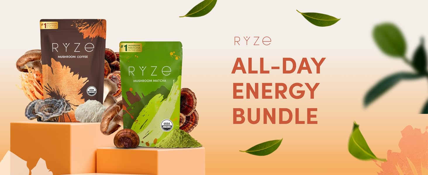 مجموعة RYZE SUPERFOODS للطاقة طوال اليوم مع فطر قهوة مشوية متوسطة الحجم + فطر ماتشا، عضوي من وزارة الزراعة الأمريكية مع 6 فطر متكيف + ماتشا للحصول على طاقة أفضل وتركيز وهضم 30+30 حصة