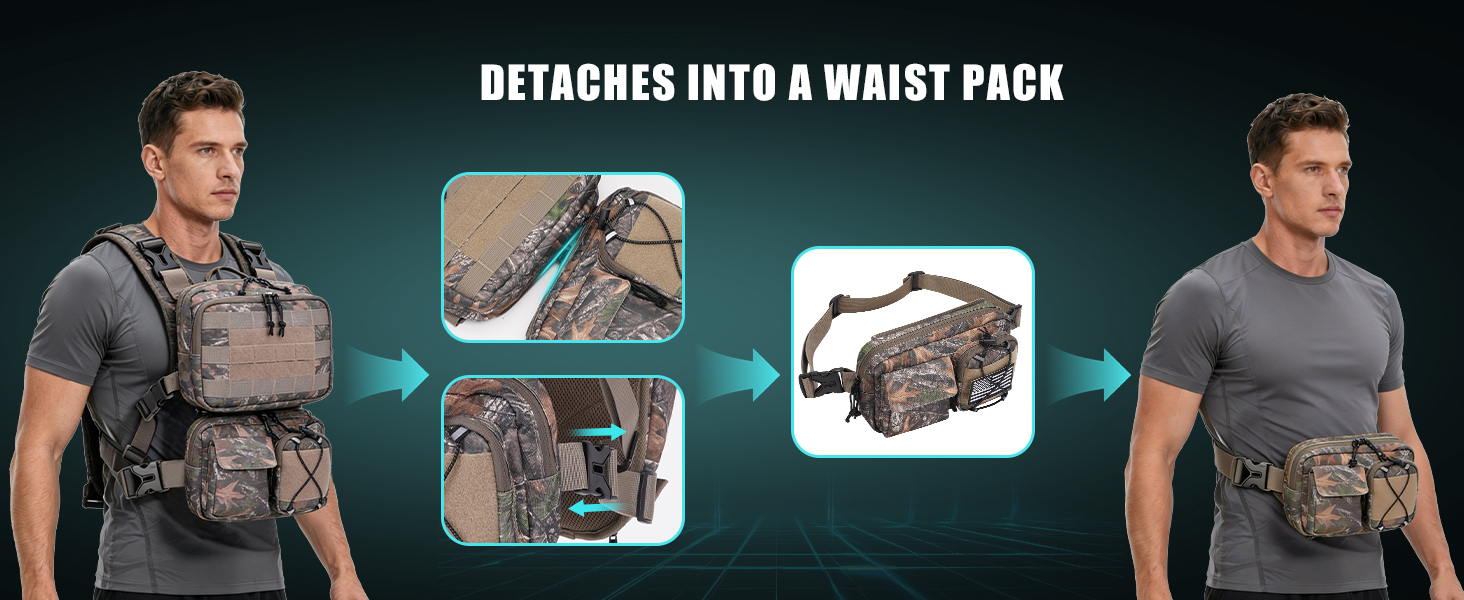 تصميم وحدات 3 في 1 - تتميز سترة الترطيب هذه بنظام 3 في 1 متعدد الاستخدامات يجمع بين حقيبة الظهر وحقيبة الصدر القابلة للفصل وحقيبة الخصر. تسمح سترة الترطيب هذه للجيب السفلي بإغلاقه كحقيبة خصر مستقلة، بينما يحافظ الجزء العلوي من الصدر على الأساسيات في متناول اليد.