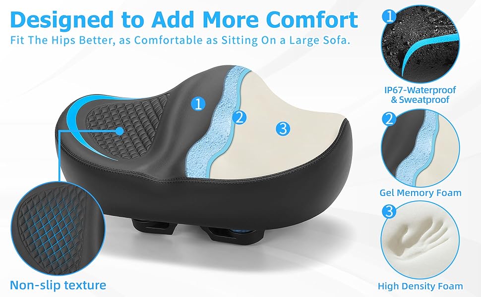 • More Effective Ergonomic Elements: Compared with traditional bicycle seats, "Concave Center Groove" padding perfectly fits the shape of the human buttocks, disperses pressure, and avoids damage to the buttocks and tailbone caused by long-term riding