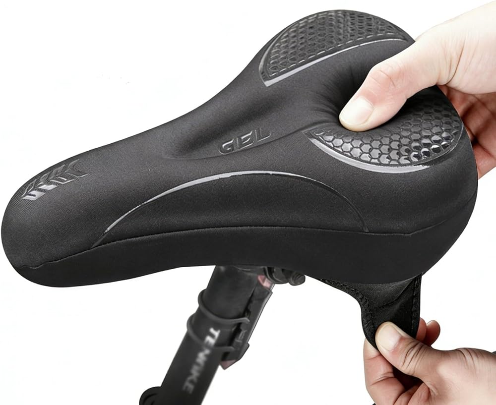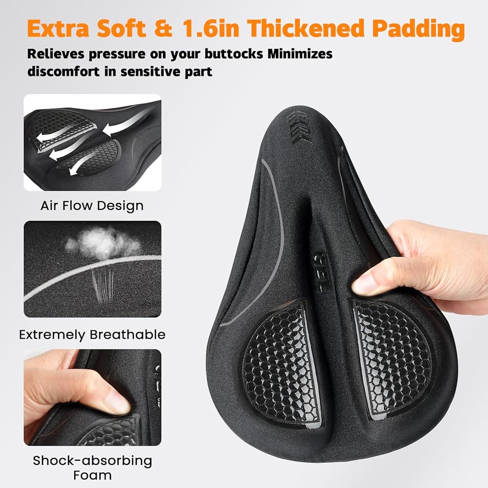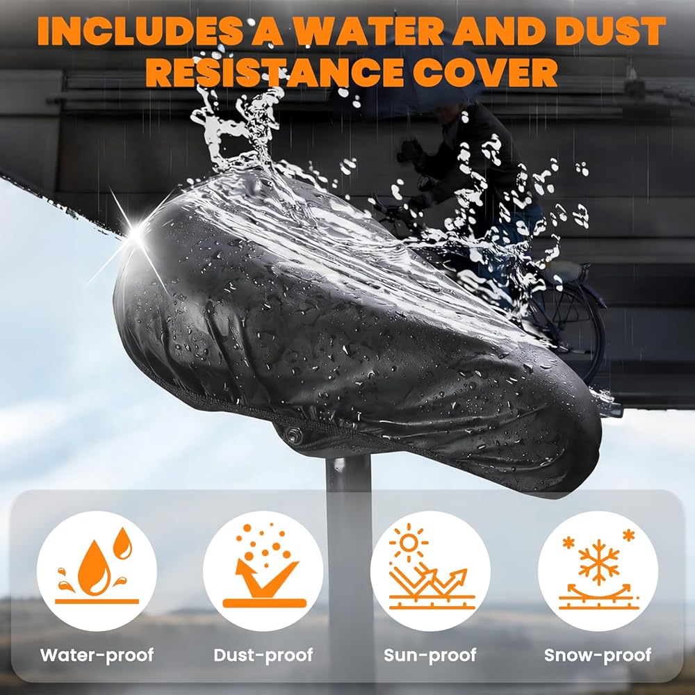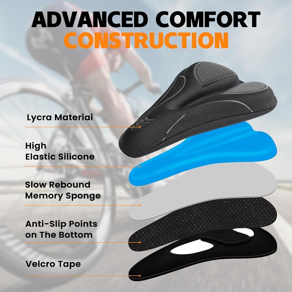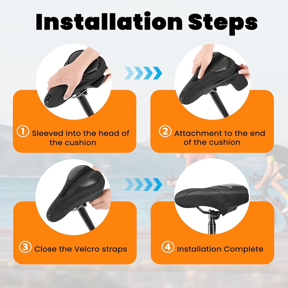 [سهلة التركيب] يتم تركيب وسادة مقعد الدراجة هذه في ثوانٍ دون الحاجة إلى أدوات. ما عليك سوى وضع غطاء مقعد الدراجة على مقعدك وتأمينه باستخدام الأشرطة المتقاطعة الموجودة أسفله. يبقى مثبتًا بإحكام أثناء الركوب، ومع ذلك يمكن إزالته بسهولة عند الحاجة.