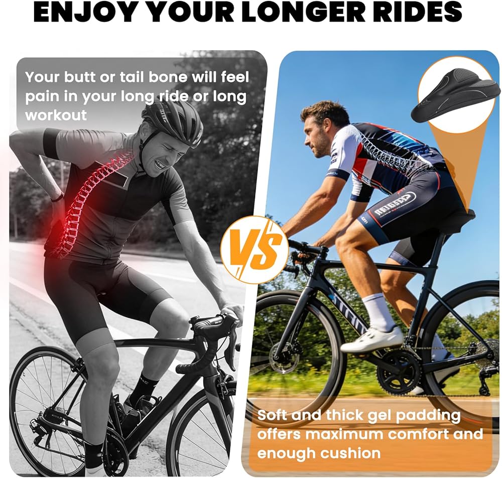 【ركوب خالٍ من الألم】مصنوعة من الجل الفاخر وإسفنج الذاكرة عالي الكثافة، تمتص وسادة مقعد الدراجة هذه الصدمات وتعيد توزيع الضغط لتخفيف إجهاد عظام الجلوس. يساعد على تقليل الألم والخدر أثناء الرحلات الطويلة، مما يجعل التدريب الداخلي أو ركوب الدراجات على الطرق أكثر راحة من الركوب على سرج صلب.