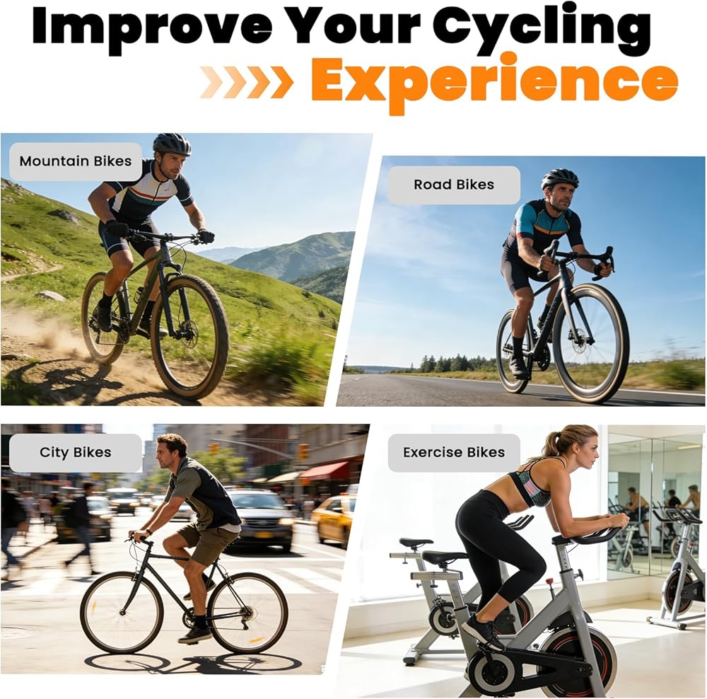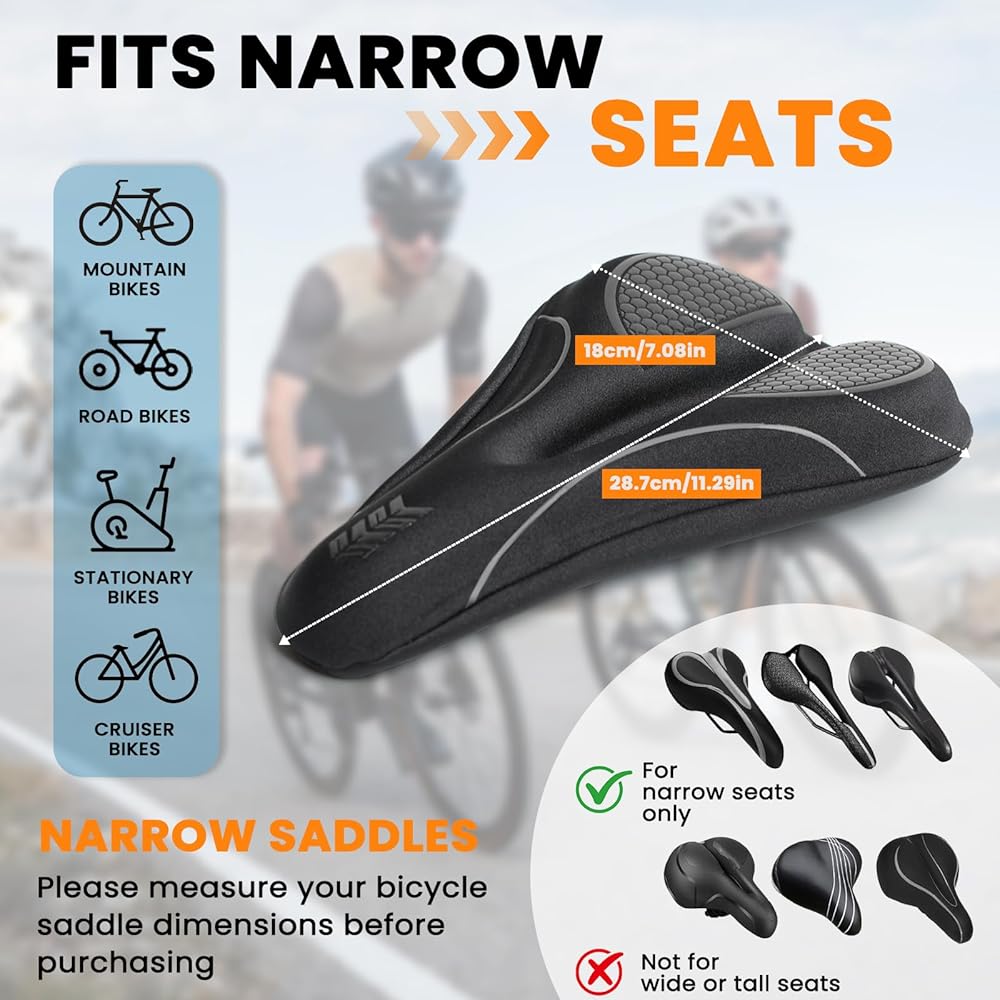 【ملاءمة المقعد الضيق】بحجم 11.3 × 7.0 بوصة، تم تصميم وسادة مقعد الدراجة هذه لتناسب السروج النحيفة دون إضافة حجم كبير أو التدخل في الدواسة. مصمم كغطاء مقعد دراجة ضيق، وهو متوافق مع دراجات بيلوتون والدراجات الثابتة ودراجات الطرق والدراجات الإلكترونية.