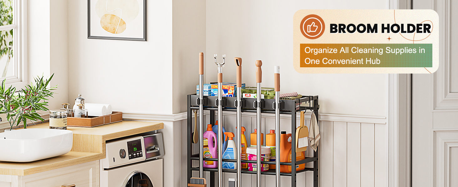 حامل مكنسة مع منظم مستلزمات التنظيف، خزانة تخزين خزانة المكنسة مع خطافات حامل شماعات الممسحة، عربة تنظيف المنزل مع علبة التنظيف، منظمة غرفة الغسيل