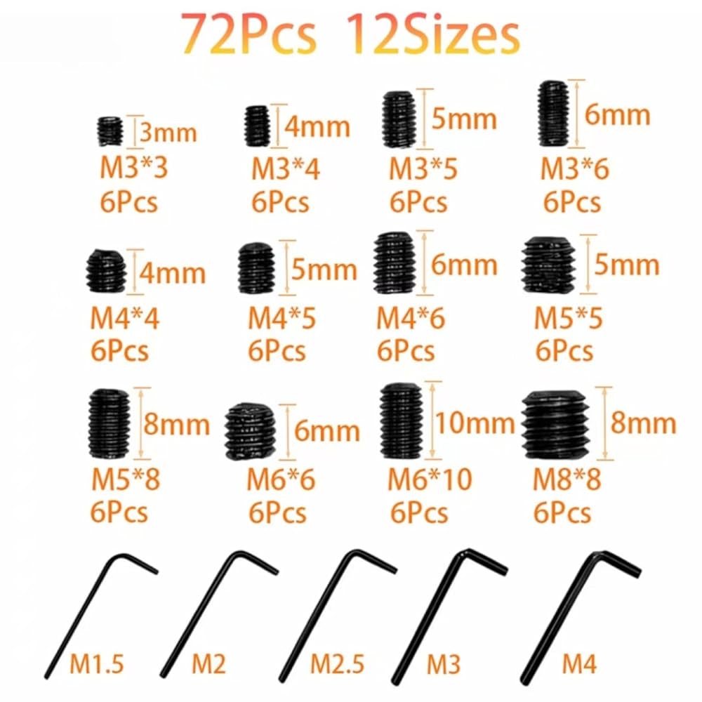 • Complete 12-Size Kit with 72 Screws & 5 Hex Keys This comprehensive kit includes 72 set screws across 12 metric sizes (M3, M4, M5, M6, M8 in various lengths) and 5 corresponding hex wrenches (Allen keys), providing a ready-to-use solution for various fastening tasks.