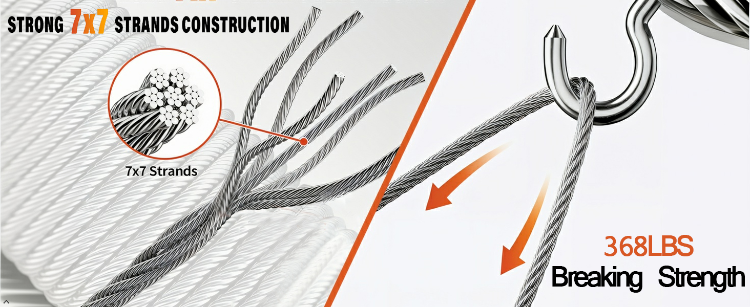 هيكل حبلا 7 × 7: حبل سلك الفولاذ المقاوم للصدأ 1/16 مصنوع من أسلاك فولاذية 7 × 7 مضفرة بإحكام لتشكيل تصميم قوي الطبقات، يمنع الالتواء والتشابك، مع قدرة تحمل أقوى. تم تصميمه بقوة كسر عالية تصل إلى 368 رطلاً، وهو رائع لاحتياجات التعليق والربط والشد المختلفة.