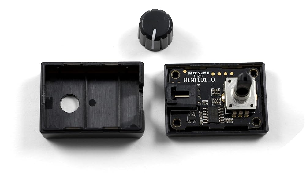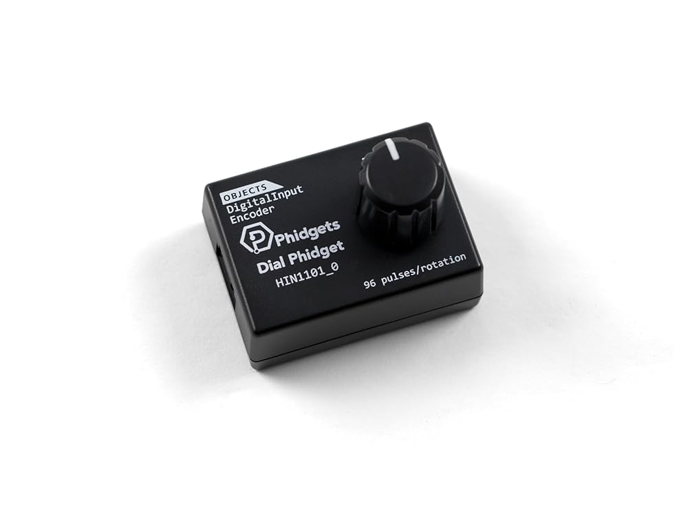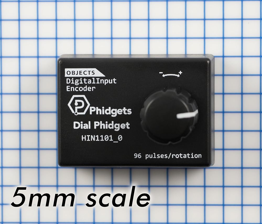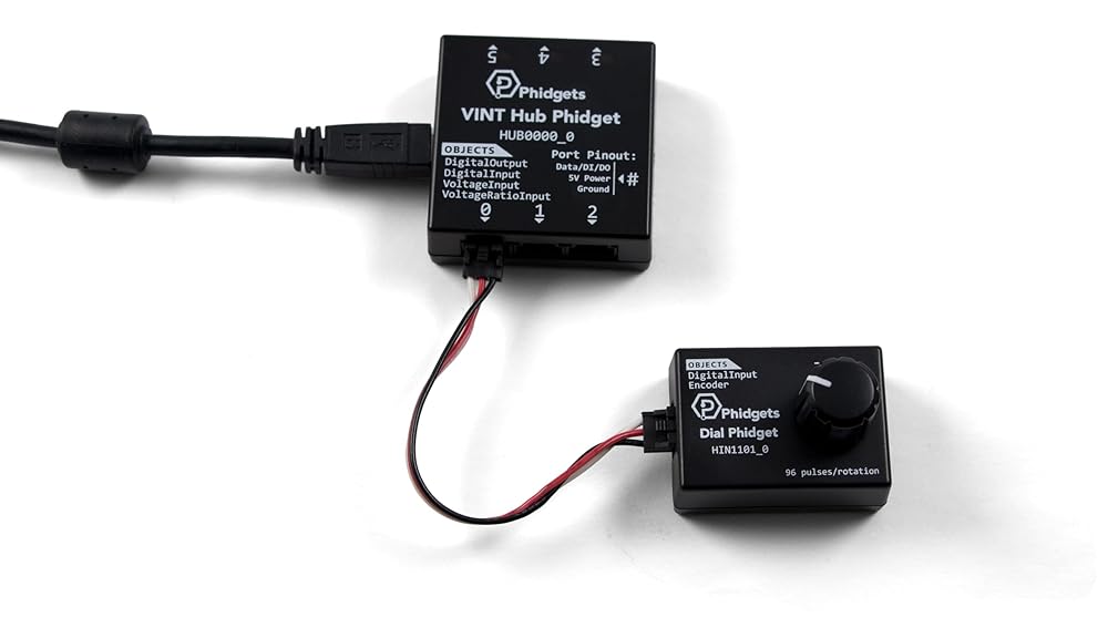 The HIN1101 combines a dial and a center pushbutton. It uses an optical encoder, so it has fully continuous rotation with none of the dead zones or physical wear that potentiometer-based dials have. The HIN1101 connects to a port on a VINT Hub. This Phidget connects to your computer through a VINT Hub.