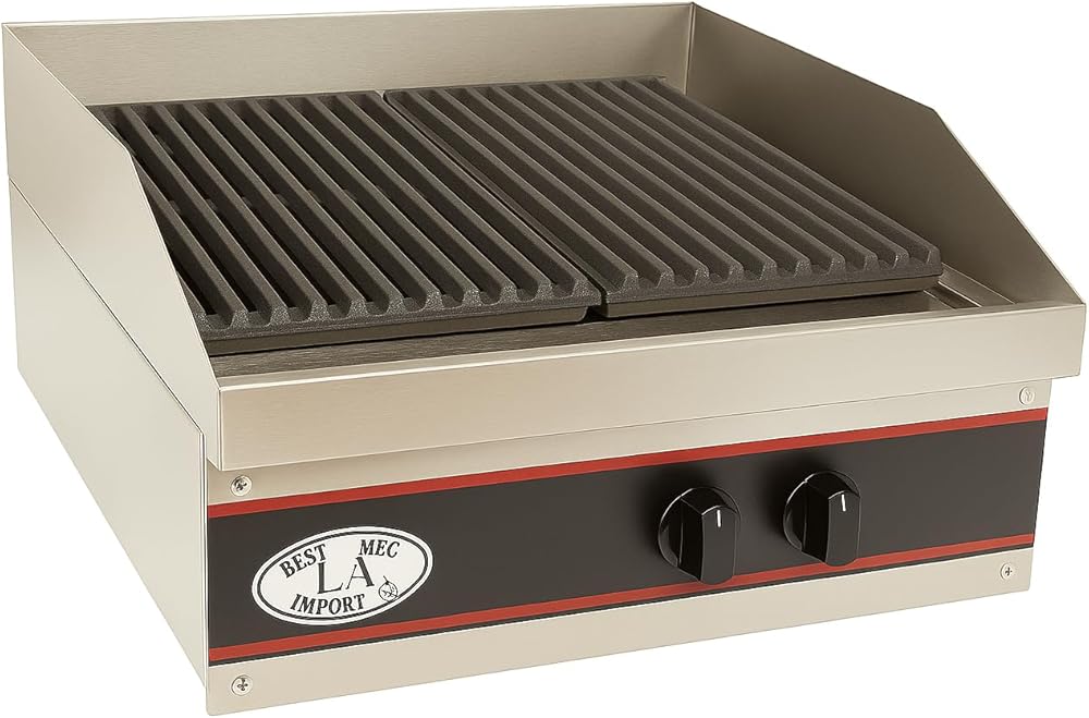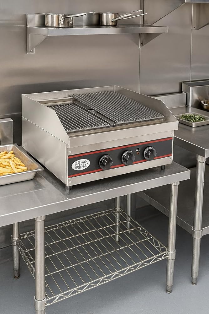 Experience high-performance grilling in a compact footprint with the Express-KitchQuip 24” Countertop Gas Charcoal Broiler. Built for busy commercial kitchens, this unit features 2 high-output burners with a combined 40,000 BTU rating—delivering consistent heat ideal for searing steaks, burgers, chicken, and more. Whether you're operating a restaurant, concession stand, or food truck, this broiler is designed to maximize flavor and efficiency. Cast iron cooking grates retain heat evenly and leave professional grill marks, while the durable stainless steel body resists daily wear in demanding environments. With a footprint of just 24" x 24", this unit fits neatly on most prep tables or equipment stands. Whether you're grilling during rush hour or running a mobile setup, this broiler gives you powerful results with minimal space.